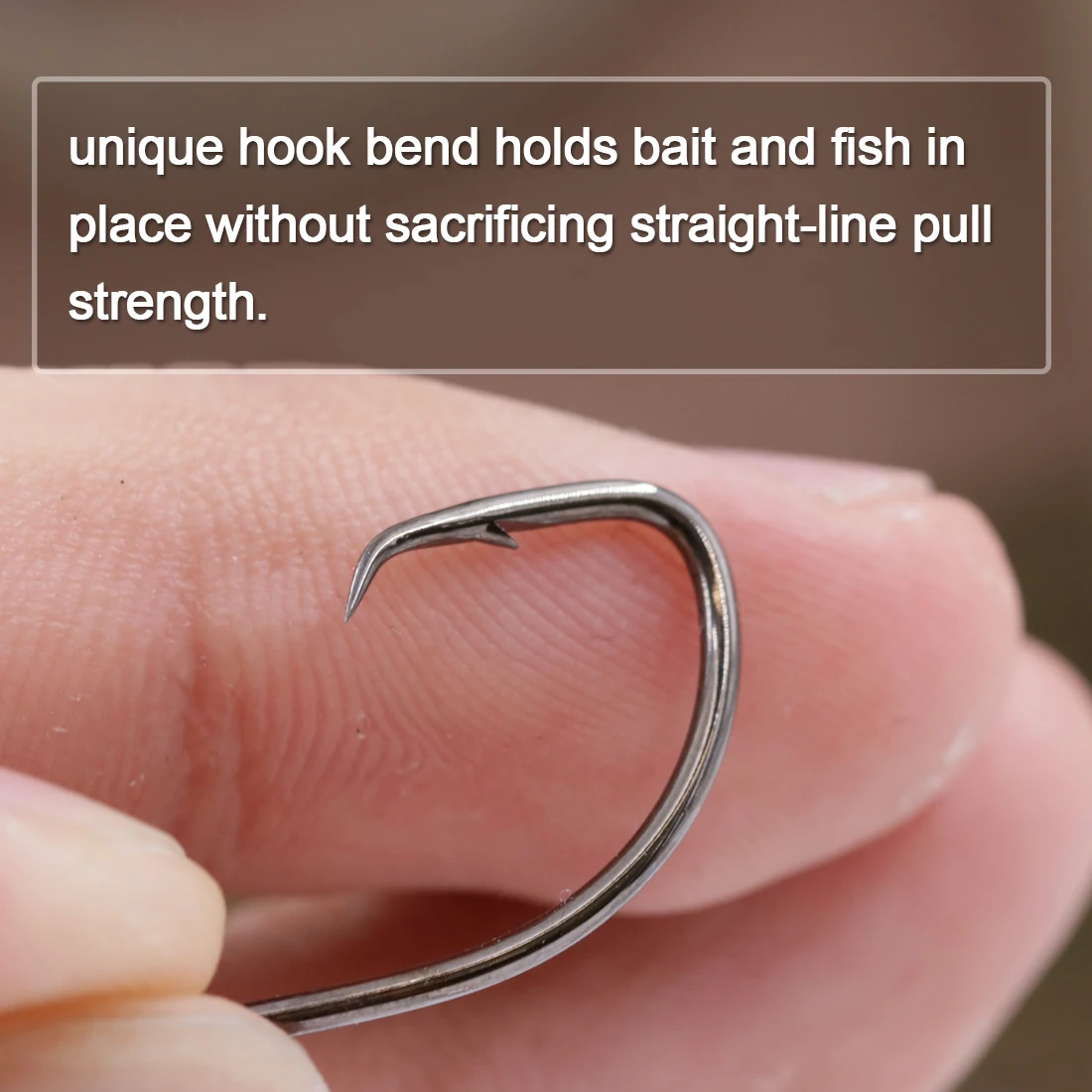 El ojo de anillo soldado de alta resistencia evita daños a la línea mono o flúor; La curva de anzuelo única mantiene el cebo y el pez en su lugar sin sacrificar la fuerza de tracción en línea recta.