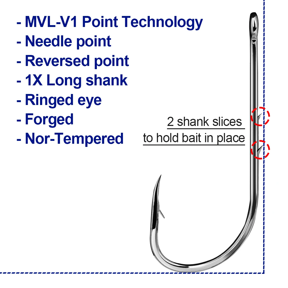 This strong, forged Beak hook features a reversed hook point for improved hook hold. It permits the point to come in contact with the mouth of the fish, without turning. The 1X long shank provides for bigger and longer worm baits. The beaked hook design offers great hookset and holding power throughout the fight.