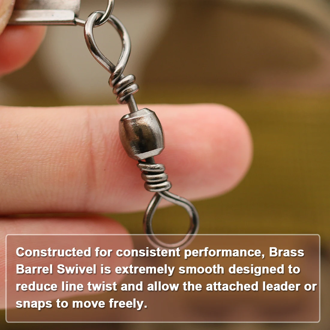 The Barrel Swivel with Snap features two main components: a barrel swivel and a snap. The barrel swivel consists of two eyelets connected by a barrel-shaped body, allowing the swivel to rotate freely. This rotation reduces line twists and prevents tangles, enhancing casting distance and lure presentation. The snap, on the other hand, is a small, spring-loaded closure mechanism that allows for quick and secure attachment of fishing gear.The combination of the barrel swivel and the snap provides several advantages for anglers. Firstly, the barrel swivel reduces line twists, which can be a common issue in fishing. Allowing the line to rotate freely, helps maintain a smooth and unrestricted movement, reducing the chances of tangles and enhancing overall fishing performance.
