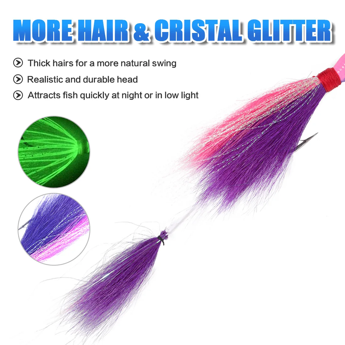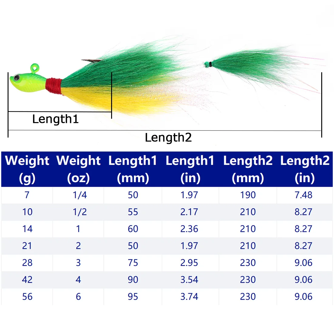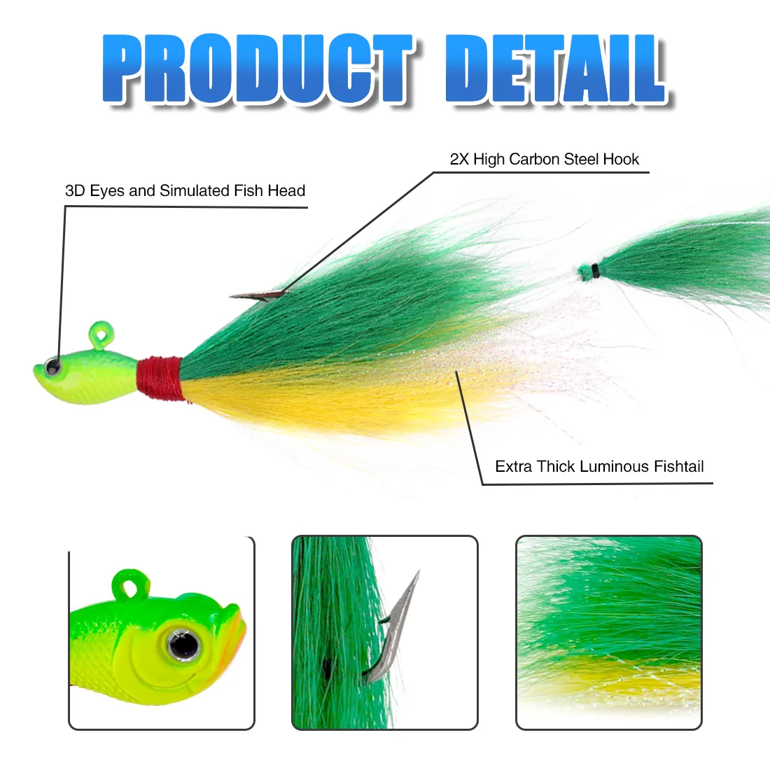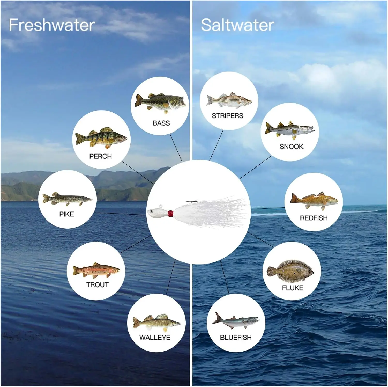 Pelo de ciervo teñido de primera calidad atado a mano y brillo de cristal.Ideal para lanzamiento y jigging vertical.El cuerpo de Bucktail Jig se mantiene paralelo para una excelente acción de jigging cuando se jig, y el cabello mojado de Bucktail "respira", parece un pez cebo moribundo.