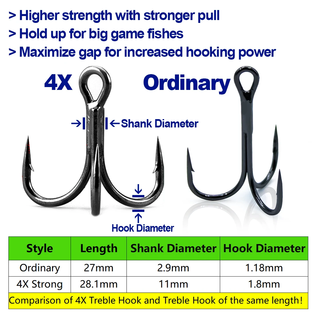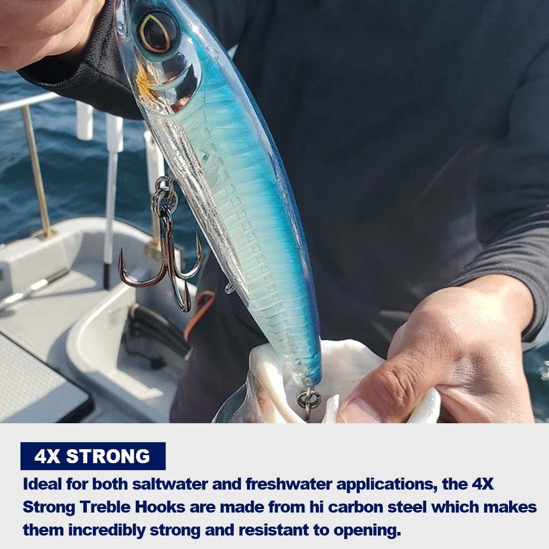 Ideales para aplicaciones de agua salada y dulce, los anzuelos triples fuertes 4X están hechos de acero con alto contenido de carbono, lo que los hace increíblemente fuertes y resistentes a la apertura.