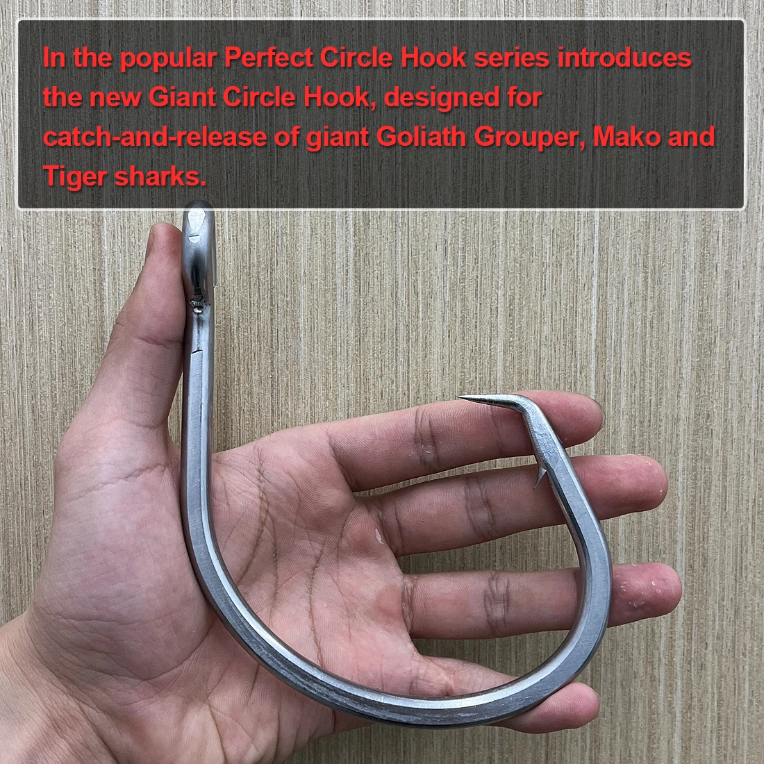 El gancho circular gigante está equipado con una micro púa que garantiza que el gancho no retroceda y se mueva durante la pelea, sino que mantenga su posición. La operación de liberación es lo contrario de invertir el anzuelo fuera de la boca del pez. Se corta la línea y se puede tirar del anzuelo desde el punto a través de la mandíbula del pez.