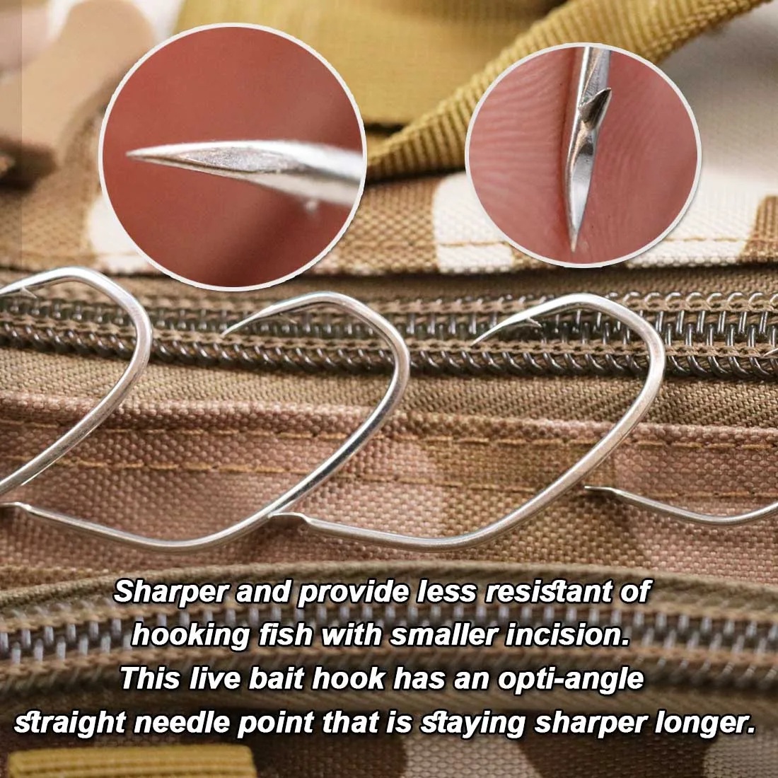 Sharper and provide less resistant of hooking fish with smaller incision. This live bait hook has an opti-angle straight needle point that is staying sharper longer.