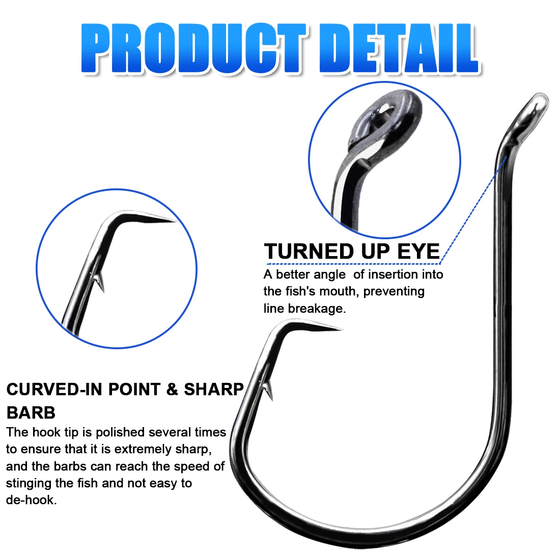 And the curved-in point and sharp barb will reach the speed of stinging the fish and not easy to de-hook.