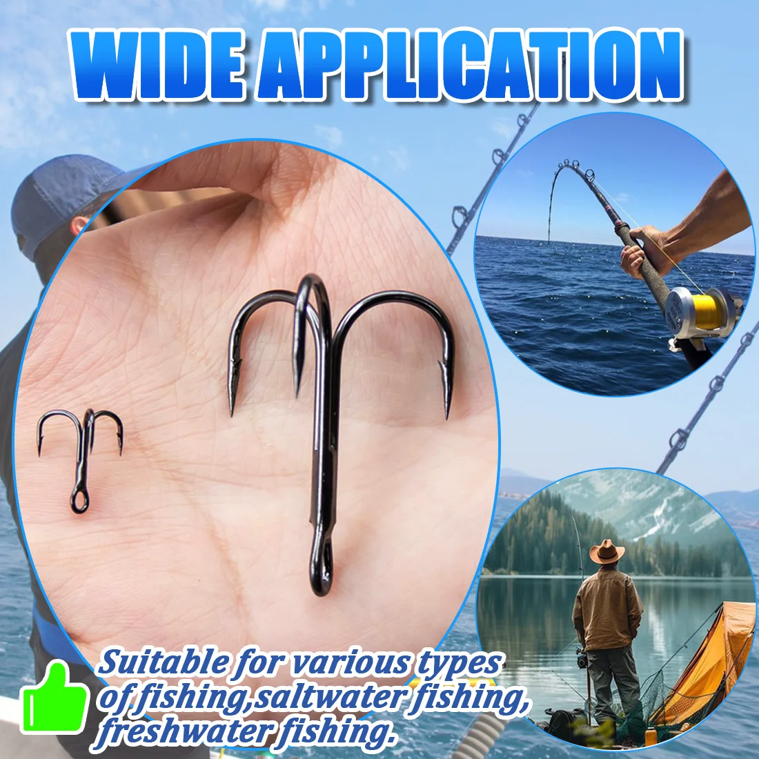 Estos anzuelos triples de pesca son los anzuelos de repuesto perfectos para tapones, cucharas, señuelos de cebo de pesca giratorios, para especies de lubina, trucha, arenque, anguila, panfish y salmón, etc.