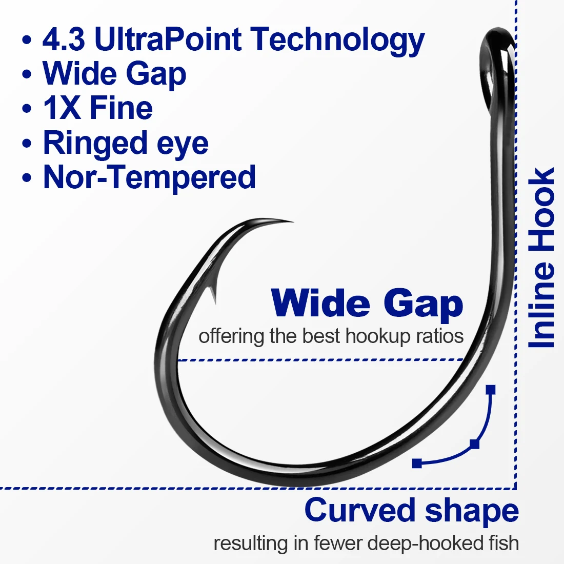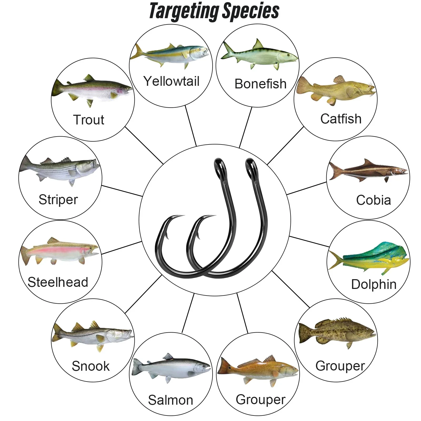 Los anzuelos circulares Demon son los mejores anzuelos circulares para pescar atún, marlín, pez vela, pez espada, tiburones, Wahoo, Halibut, Amberjack, Permit, lubina rayada, Skipjack, Bonito, Bluegill, pez pan, pez sol, pez gato o gar de cocodrilo.