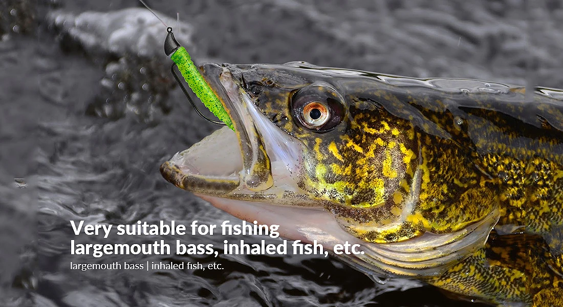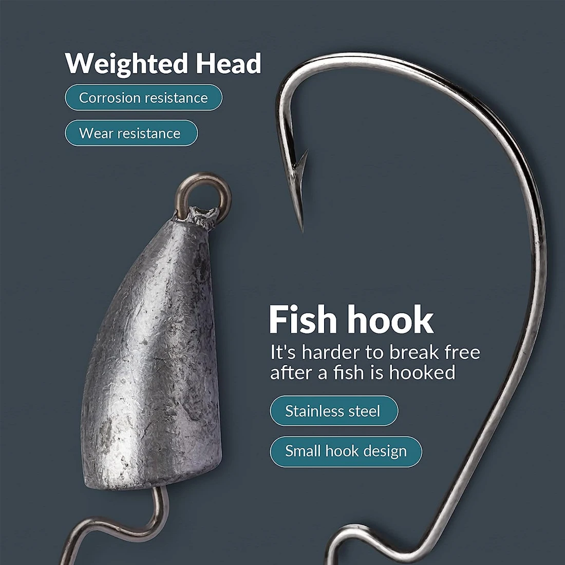 Cuenta con 90 hombros doblados y gancho de amplio espacio.Úselos para montar swimbaits de plástico, señuelos de cola rizadora y cangrejos para la pesca del lubina.