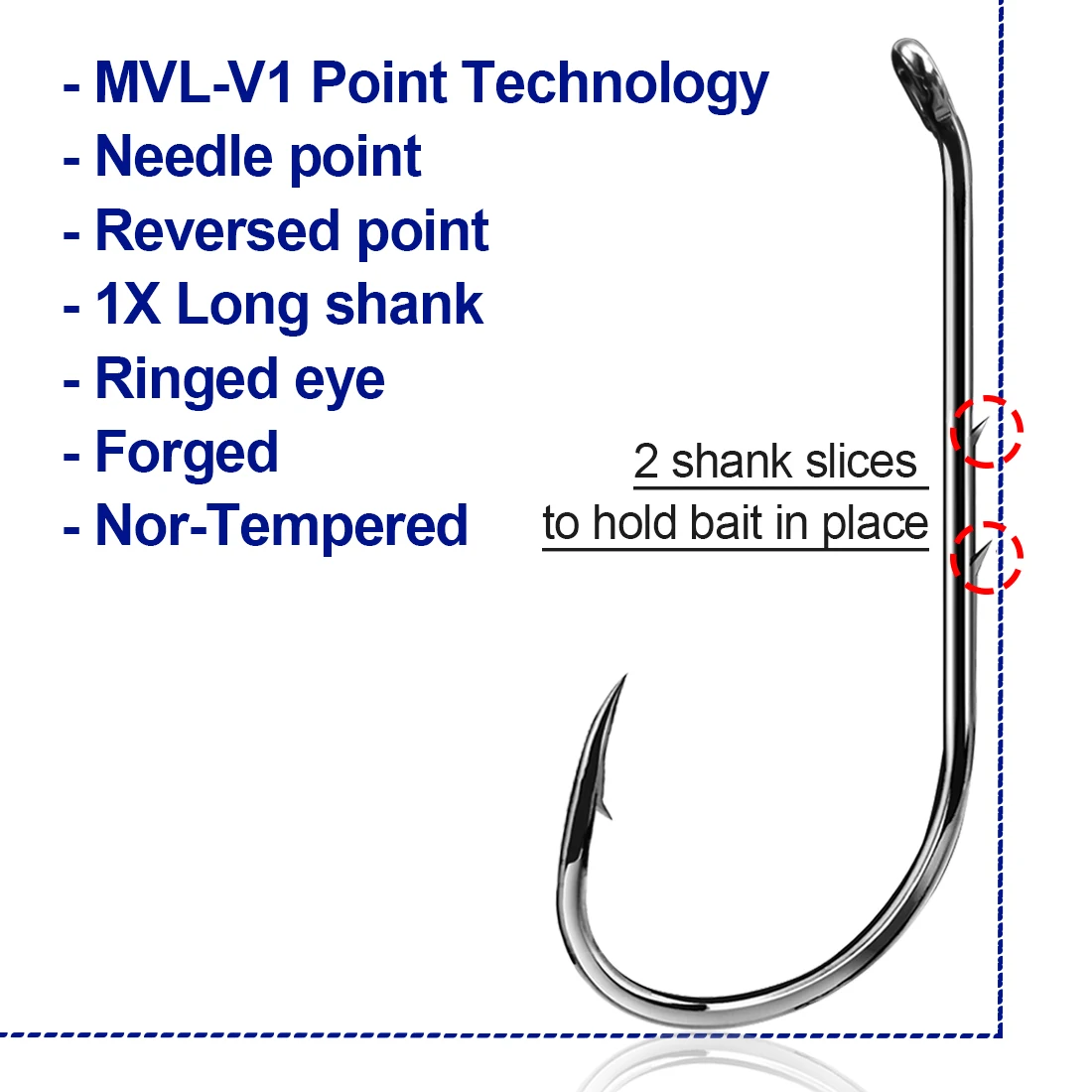 The 1X long shank provides for bigger and longer worm baits. The beaked hook design offers great hookset and holding power throughout the fight.