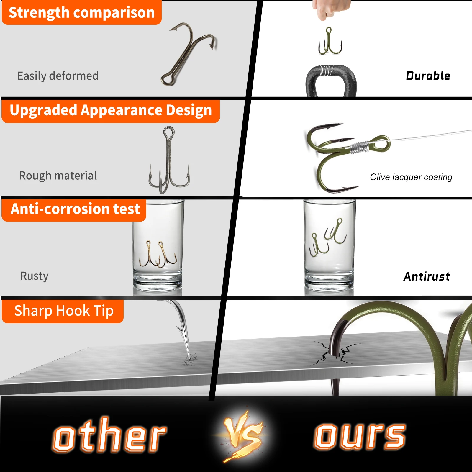 De rápida penetración, la punta de los anzuelos triples es más afilada que otros anzuelos de pesca.La estabilidad es fuerte, lo que evita más que los peces se escapen.Adecuado para la pesca en agua dulce y salada.