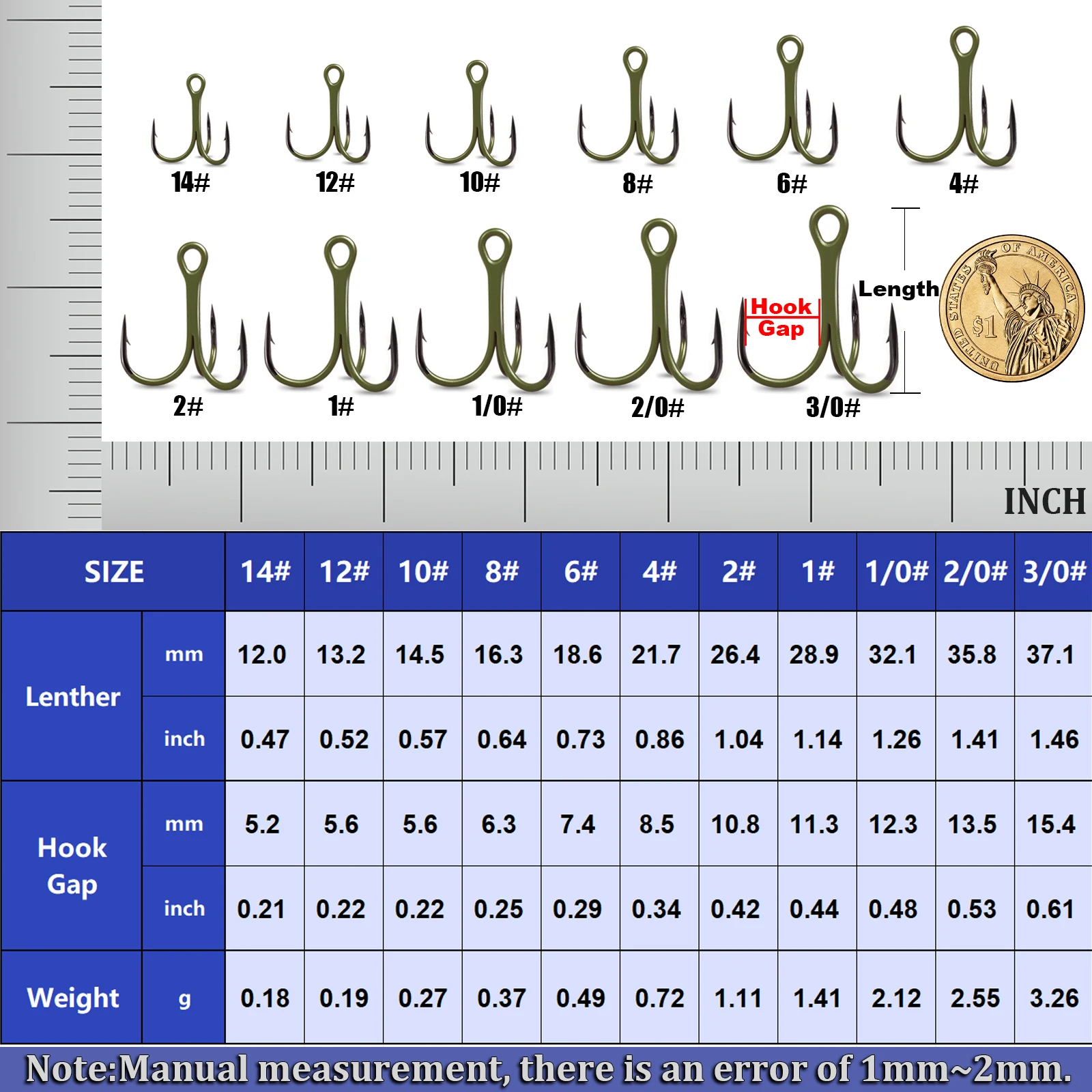 Ganchos de púas, Extremadamente afilados, Ojo cerrado, Pequeño espacio ancho, Curvatura especial.3 ganchos curvos hacia atrás y diseño de púas.La punta de los anzuelos para enganchar combina un diseño de punta más eficiente con un nuevo proceso de afilado para mejorar la calidad.