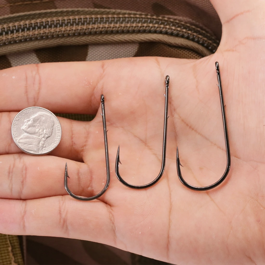 Este gancho porta cebos cuenta con dos rebanadas/púas en el vástago para sujetar mejor el cebo en su posición y ocultar el punto. Dependiendo del tamaño del anzuelo, puede usarlo para apuntar a la mayoría de las especies de peces planos, besugo, bacalao, lubina y muchas otras especies de agua dulce y salada.