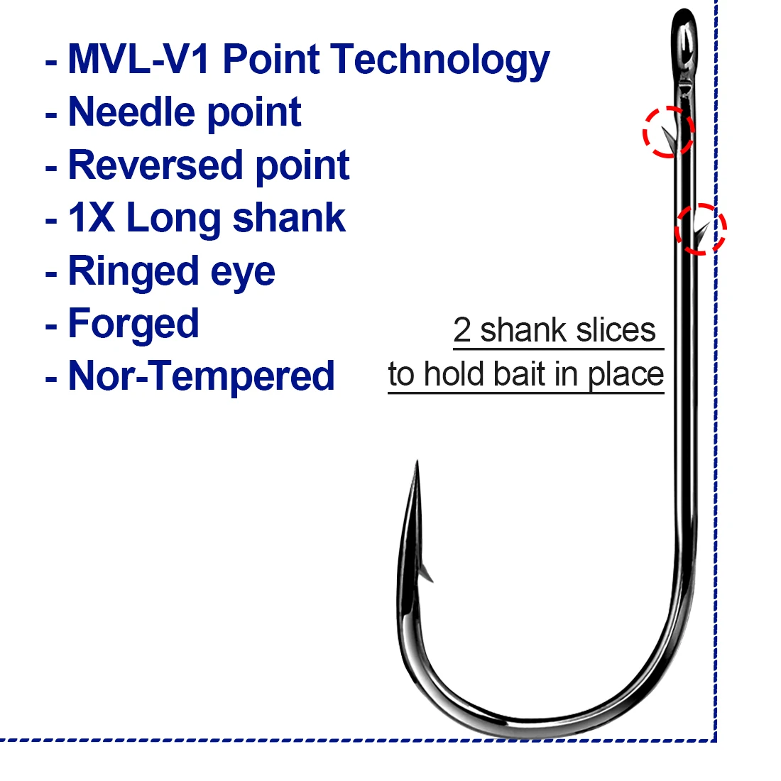 El vástago largo 1X proporciona cebos de gusano más grandes y más largos. El diseño de gancho con Pico ofrece un gran juego de anzuelo y poder de sujeción durante toda la pelea.