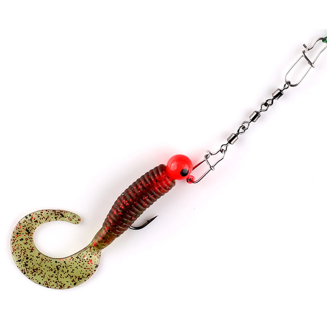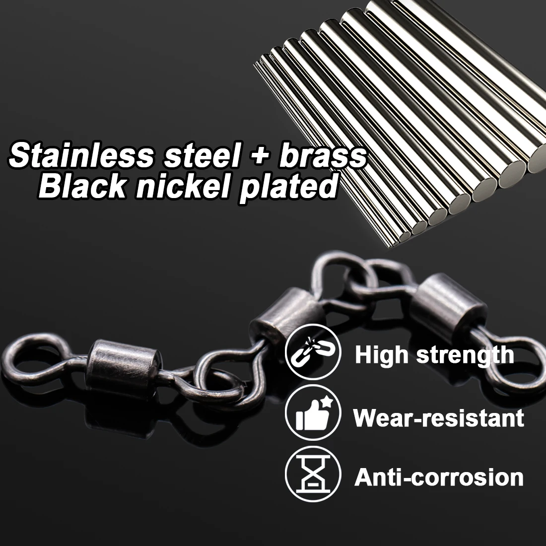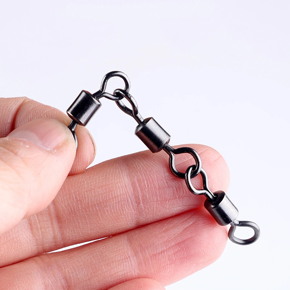 Rotación flexible de 360 °: los eslabones giratorios de pesca giran lo suficientemente bien como para mantenerse al día con las rotaciones del señuelo, y puede reducir los enredos y los giros en la línea incluso si las corrientes de agua son fuertes. Con tres eslabones giratorios, que pueden proporcionar una rotación más flexible.