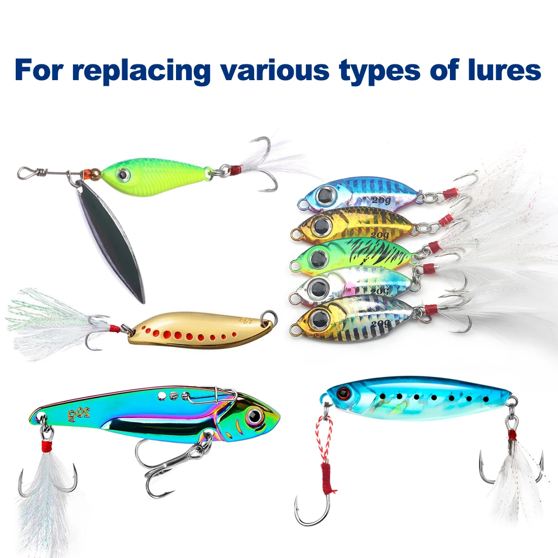 Cuando se añaden a la parte posterior de un cebo de superficie, crankbait o cuchara, ondulan y se extienden Al detenerse, atrayendo más golpes imitando el movimiento de la cola de un pececillo.