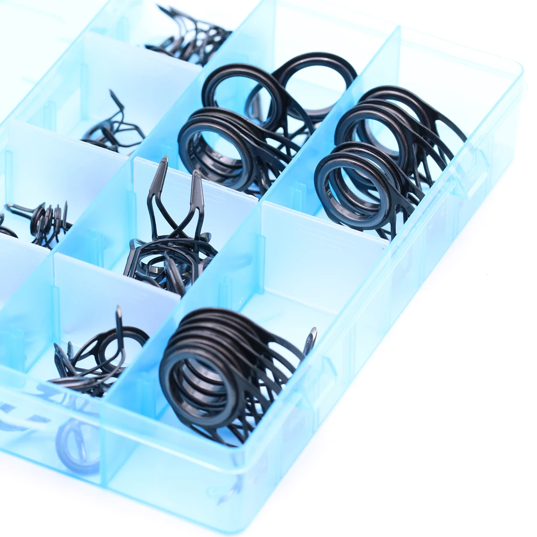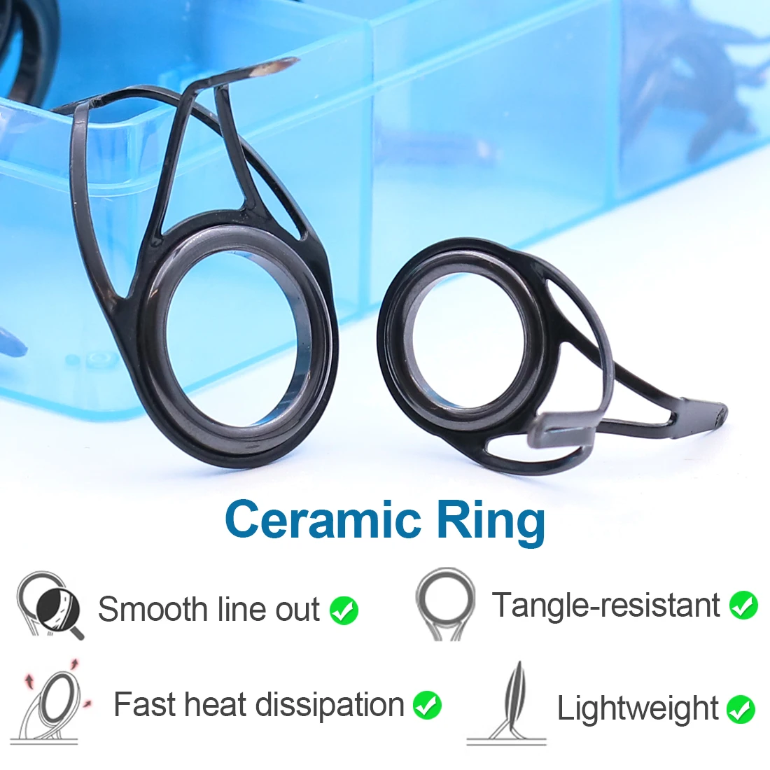 The fishing rod guide tips are made of stainless steel frame with ceramic ring, 10 sizes eyelets meet the various types of fishing rods owned by professional anglers.Both freshwater and saltwater/sea fishing are available.