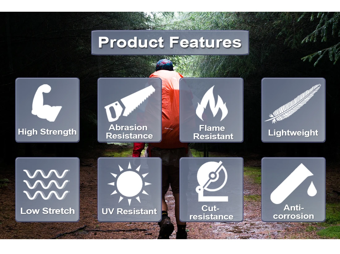 El cordón de Kevlar es una gran elección.Aplicaciones de cohetes/pesca/embalaje/escalada/mochila.¡Especialmente cuando se combina con la Wilderness Survival! La línea Kevlar siempre será un buen compañero y ayudante en actividades al aire libre.