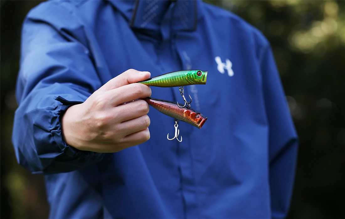 Aunque hay una variedad de señuelos Topwater disponibles, los dos tipos más populares serían los señuelos tipo poppers y "pasear al perro", también conocidos como "fantasmas". Estos señuelos no se hunden y están diseñados para imitar a un pez cebo que lucha en la superficie del agua.