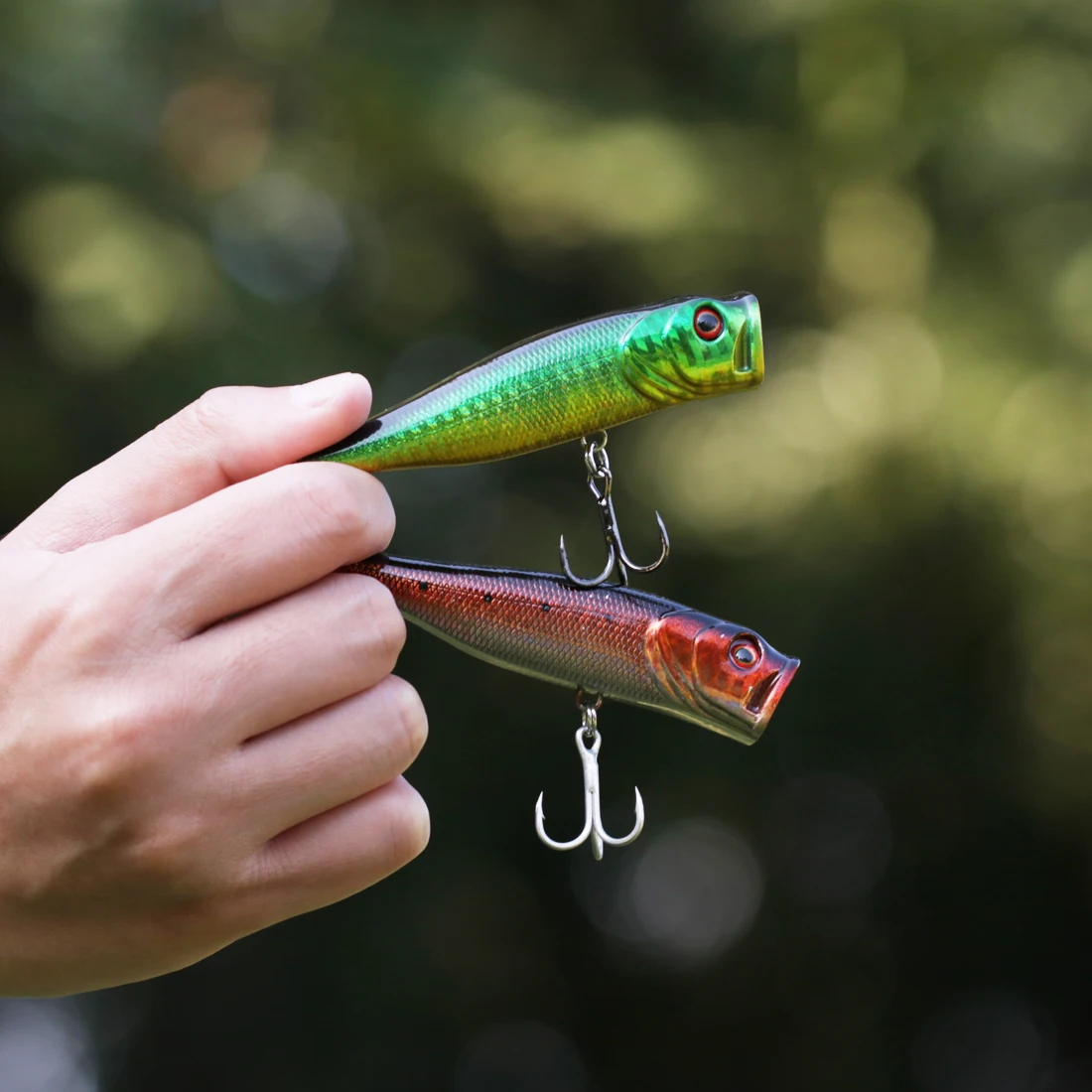 Estos tipos de señuelos se utilizan en la superficie del agua. Imitan un cebo herido, aunque también pueden imitar pájaros y ranas. Tienen un efecto de gorgoteo y hacen ruido para atraer a su pez objetivo. Los depredadores de peces que luchan contra los señuelos de superficie ofrecen la experiencia de pesca más emocionante mientras el pez persigue, lucha y golpea los señuelos.