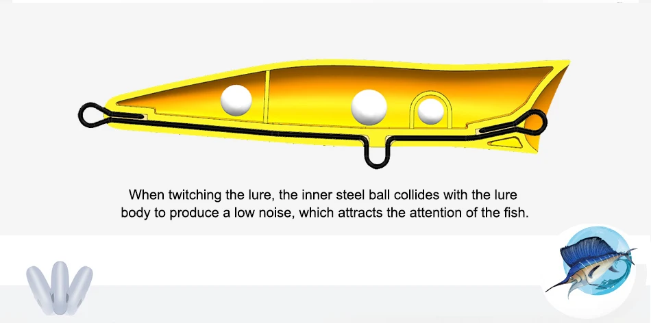 1.When twitching the lure, the inner steel ball collides with the lure body to produce a low noise, which attracts the attention of the fish