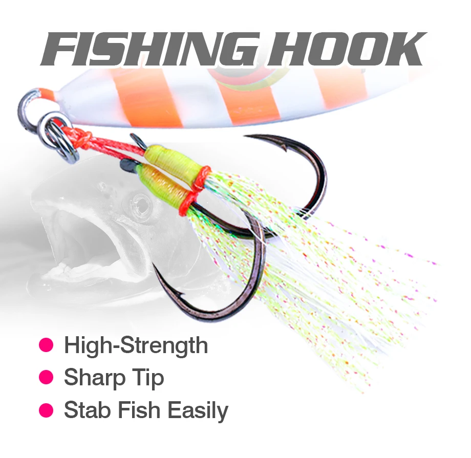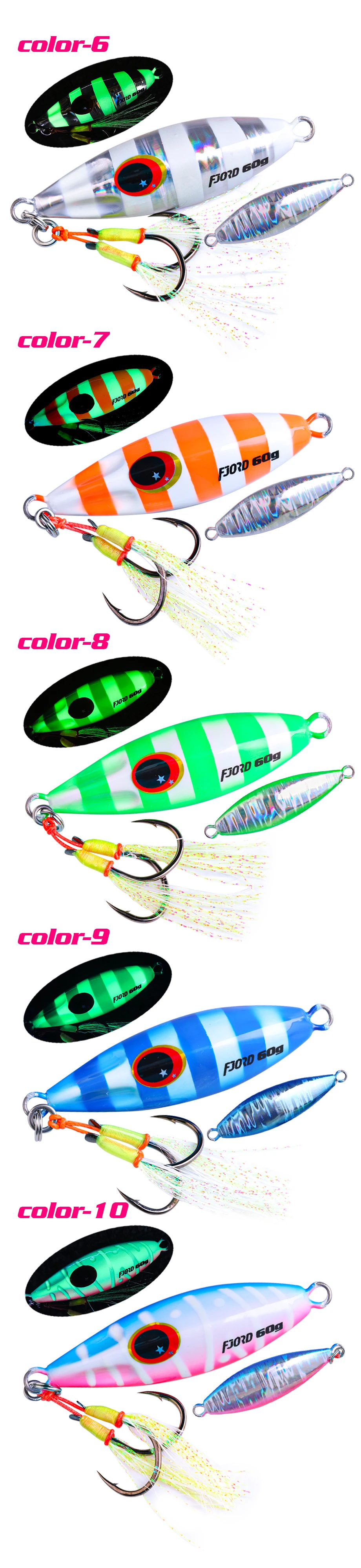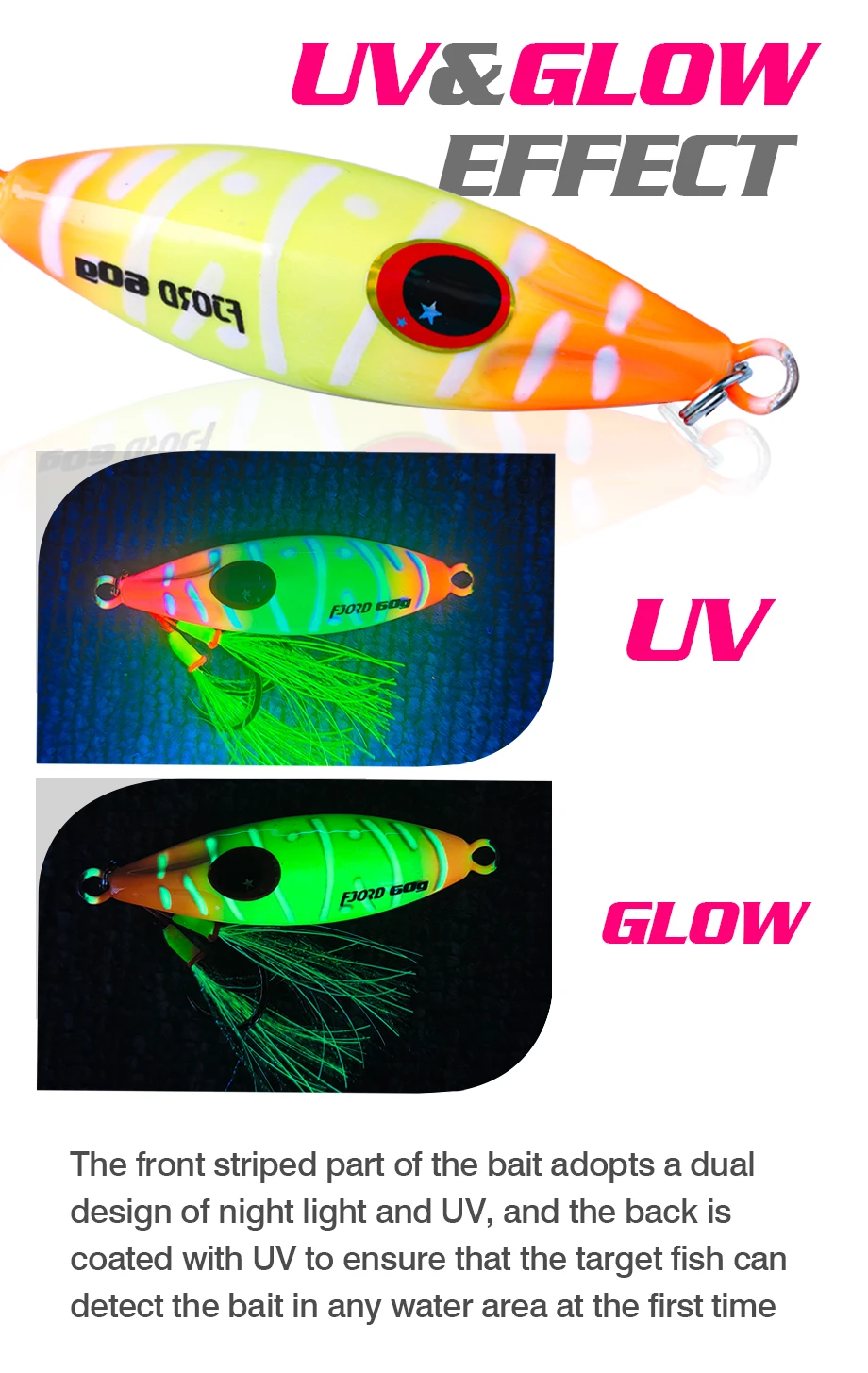1. EFECTO BRILLO:La parte delantera a rayas del cebo adopta un diseño dual de luz nocturna y UV, y la parte posterior está recubierta con UV para garantizar que el pez objetivo pueda detectar el cebo en cualquier área de agua la primera vez.