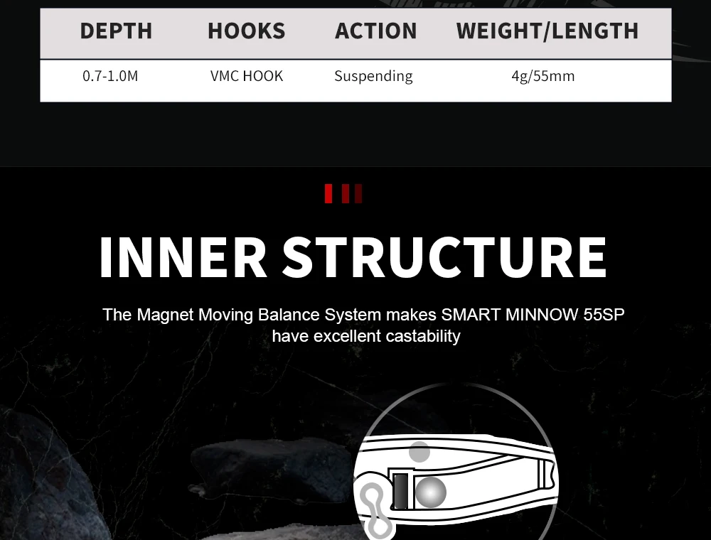 El sistema de equilibrio móvil magnético hace que SMART MINNOW 55SP tenga una excelente colabilidad