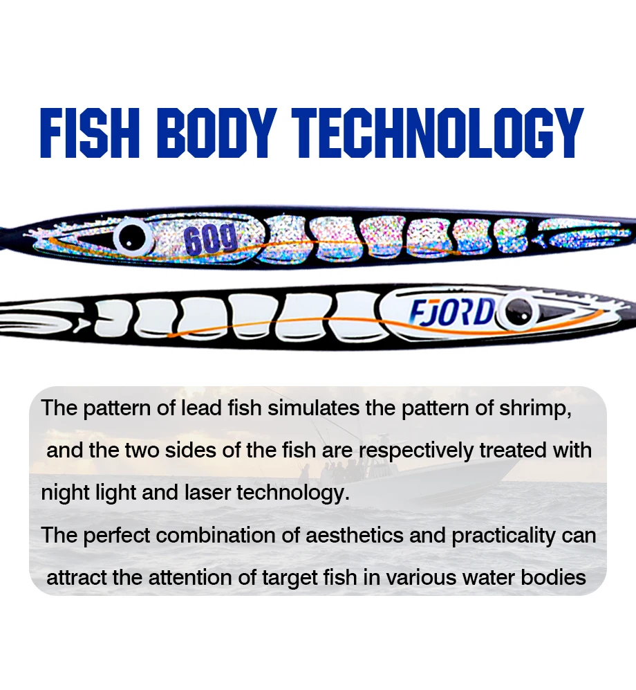 1.Tecnología del cuerpo del pez:El patrón de peces de plomo simula el patrón de camarones y los dos lados del pez están tratados respectivamente con luz nocturna y tecnología láser.