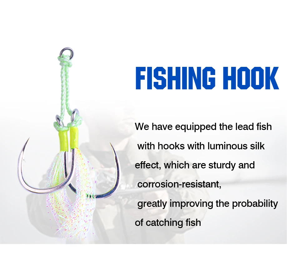 2. Anzuelo de pesca:Hemos equipado el pez principal con anzuelos con efecto de seda luminosa, que son robustos y resistentes a la corrosión, lo que mejora en gran medida la probabilidad de pescar.