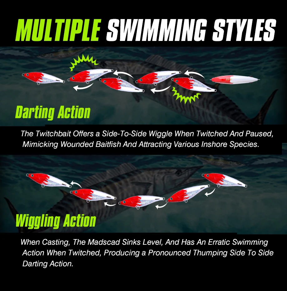 El Twitchbait ofrece un movimiento de lado a lado cuando se contrae y se coloca, imitando peces cebo heridos y atrayendo varias especies costeras.