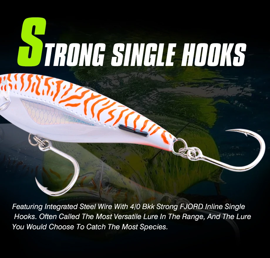 5. GANCHOS ÚNICOS FUERTES:Con alambre de acero integrado con ganchos individuales en línea FJORD fuertes 4/0 Bkk.A menudo se le llamó el señuelo más versátil de la gama y el señuelo que elegiría para capturar la mayor cantidad de especies.