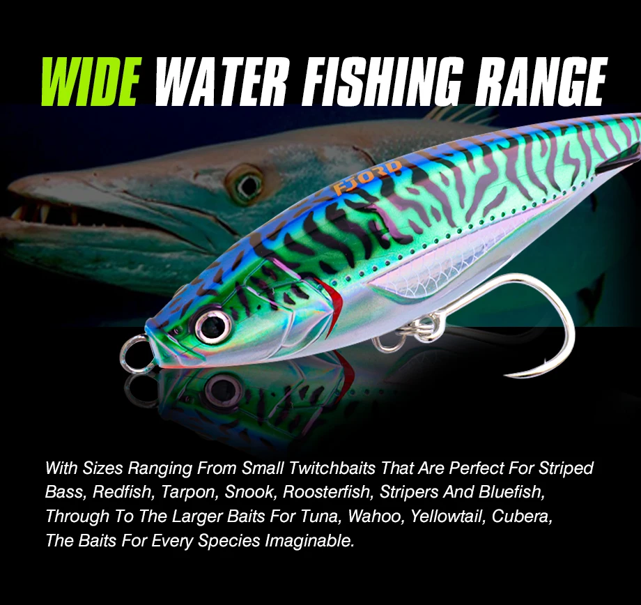 2. AMPLIO RANGO DE PESCA DE AGUA:Con tamaños que van desde pequeños Twitchbaits que son perfectos para lubinas rayadas, gallos rojos, tarpones, snooks, gallos, stripers y peces azules, a través de los cebos más grandes para atún, Wahoo, Yellowtail, Cubera, los cebos para cada especie imaginables.