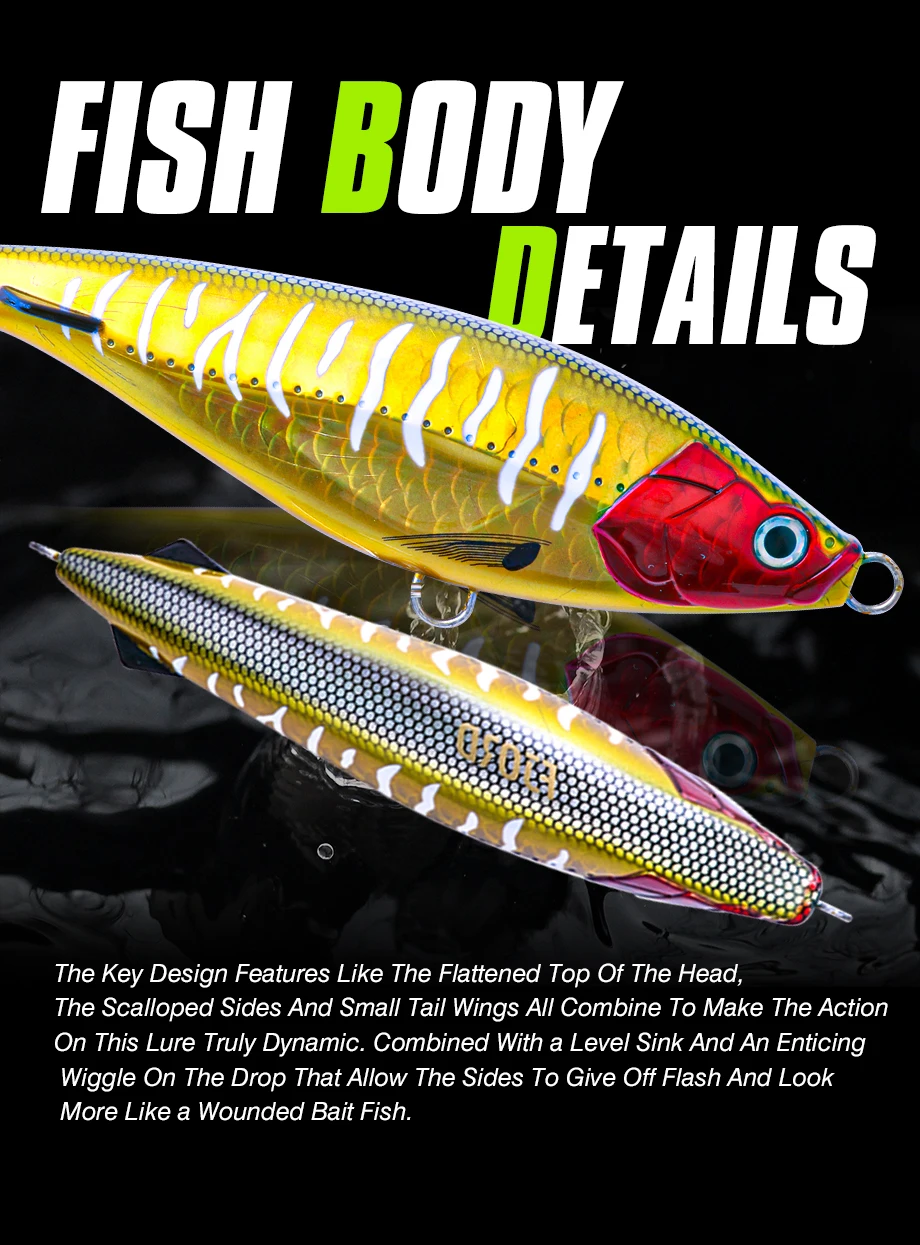 4. DETALLES DEL CUERPO DE PESCA:El diseño clave presenta como la parte superior aplanada de la cabeza, los lados festoneados y las alas de cola pequeñas se combinan para que la acción en este señuelo sea verdaderamente dinámica.Combinado con un fregadero de nivel y una inquietud en la gota que permite que los lados den destellos y parezcan más como un pez cebo herido.