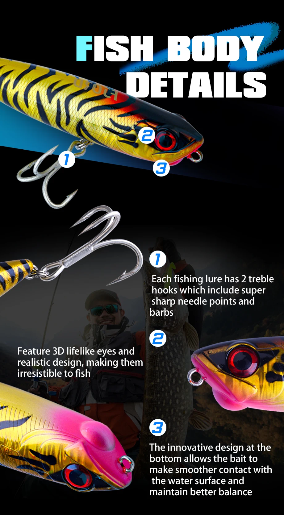 Anzuelo: cada señuelo de pesca tiene 2 anzuelos triples que incluyen puntas de aguja y púas súper afiladas.