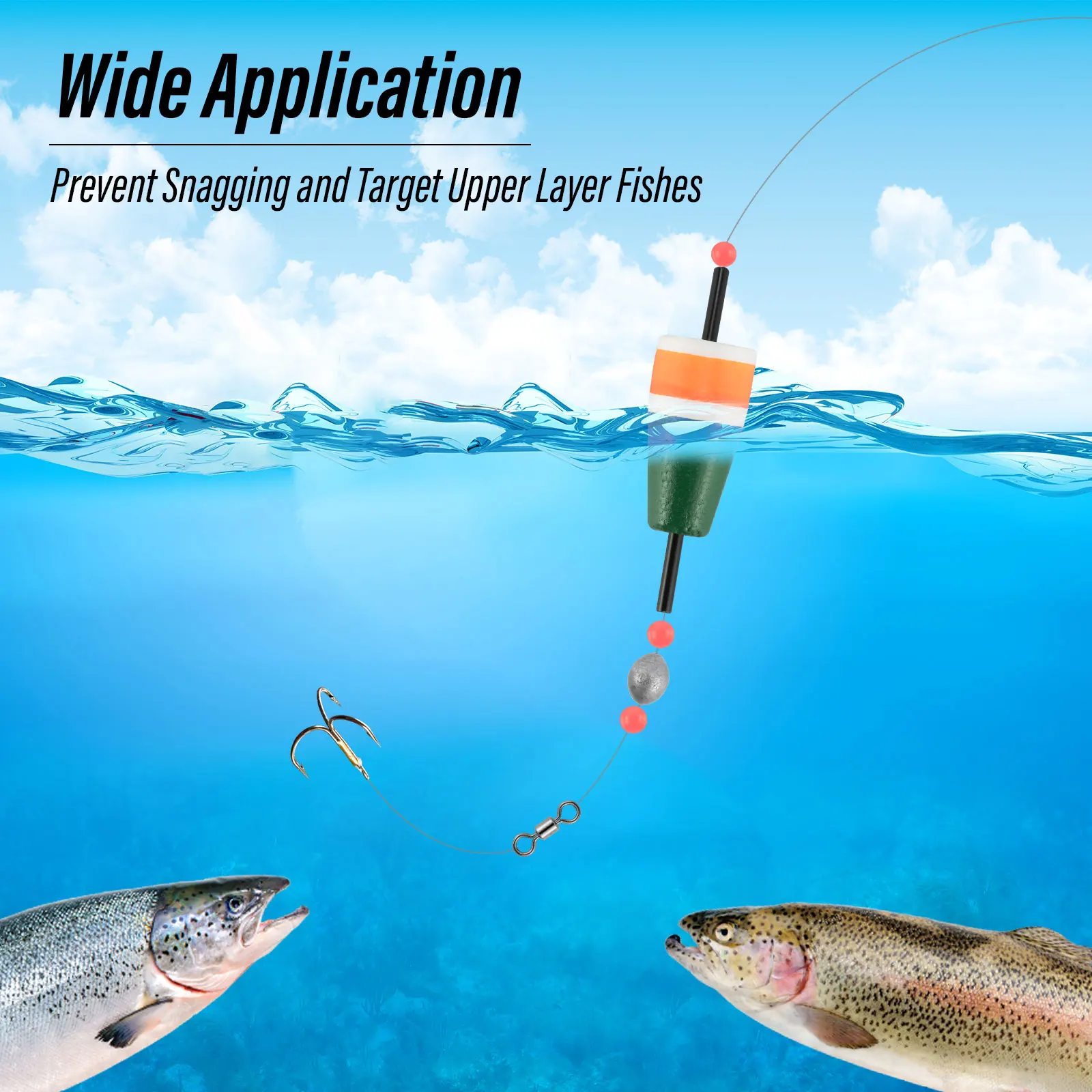 Amplia aplicación:Voltear su aparejo en la superficie del agua evita que su aparejo se enganche, al mismo tiempo le ayuda a apuntar a los peces en las capas superiores del agua. Se puede utilizar con todo tipo de señuelos, incluidos señuelos blandos, jigs, incluso cebos vivos para pesca en agua salada y en agua dulce, lubina, lucioperca, almizclado y otros.