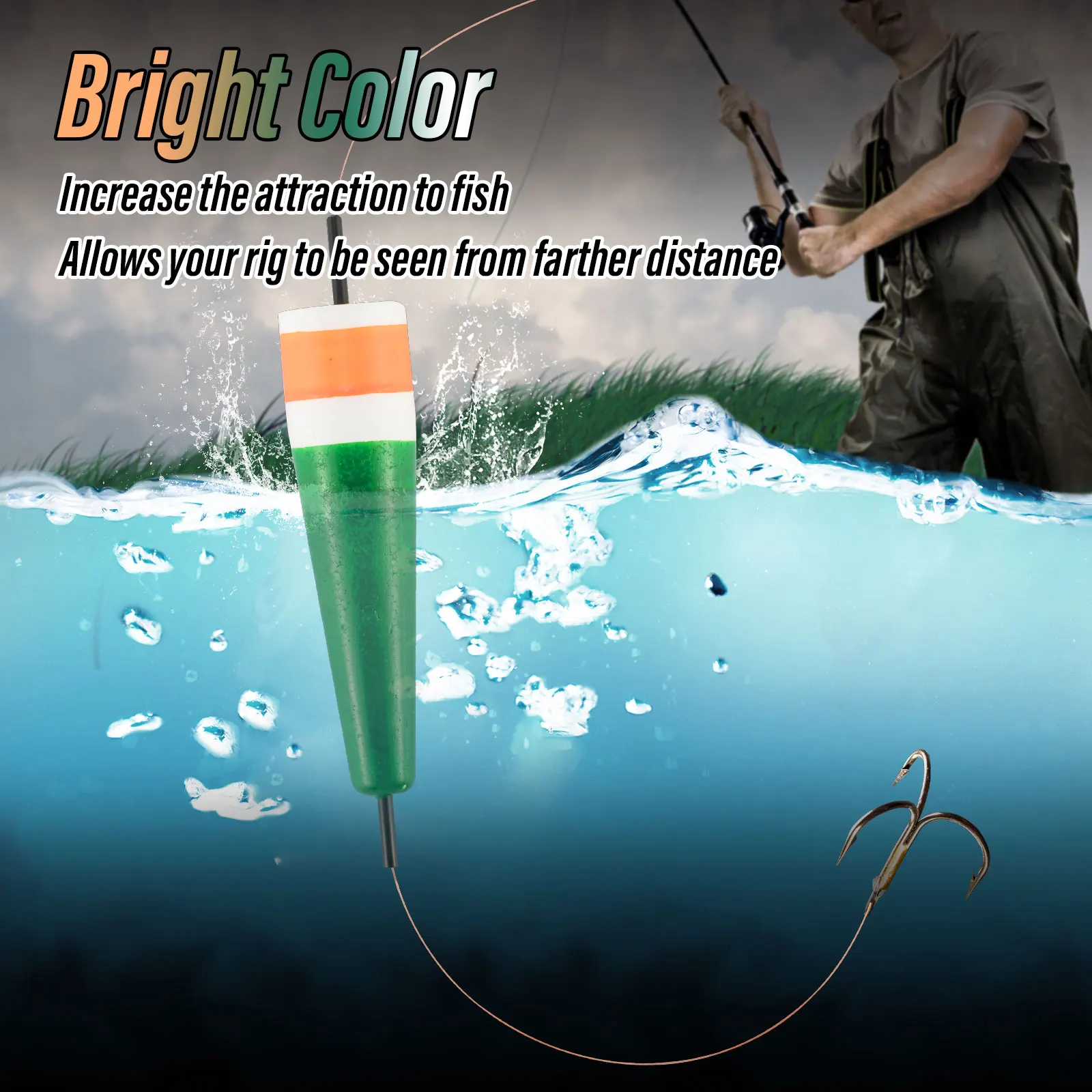 El color flotante del corcho permite que su plataforma sea vista desde más lejos, mientras que su diseño en forma de cono genera salpicaduras de agua para atraer peces hambrientos. Además, las cuentas y el peso que añadas crearán ruidos como atracción adicional.