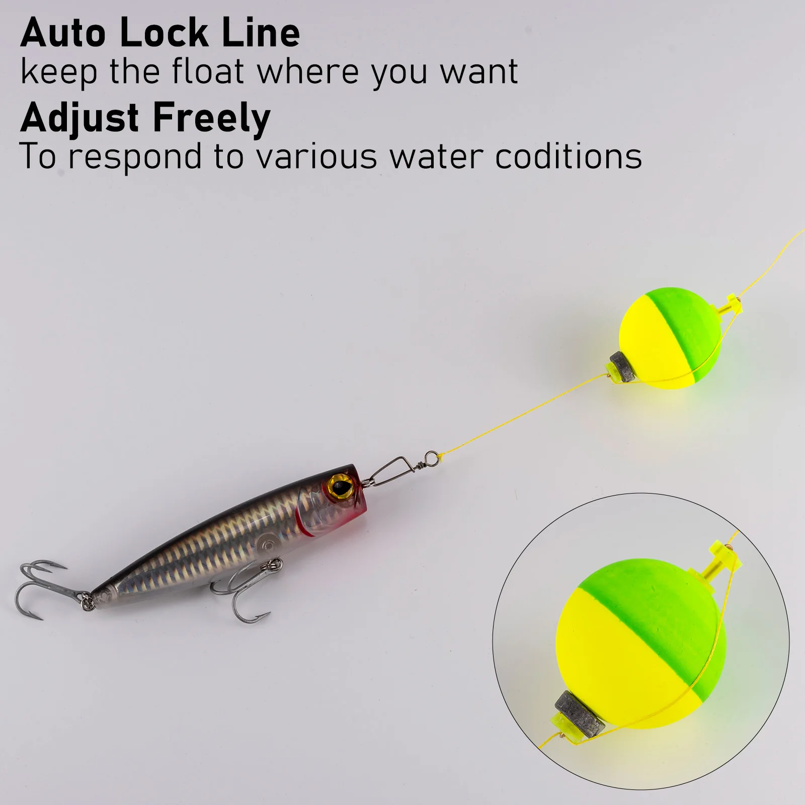 Diseño a presión: flotador a presión que mantiene el señuelo suspendido sobre la parte inferior a la profundidad deseada.El diseño fijo con resorte permite un ajuste de profundidad rápido y sencillo.El diseño de bobber con peso ayuda a que el flotador entre al agua rápidamente y mantenga cierta flotabilidad.