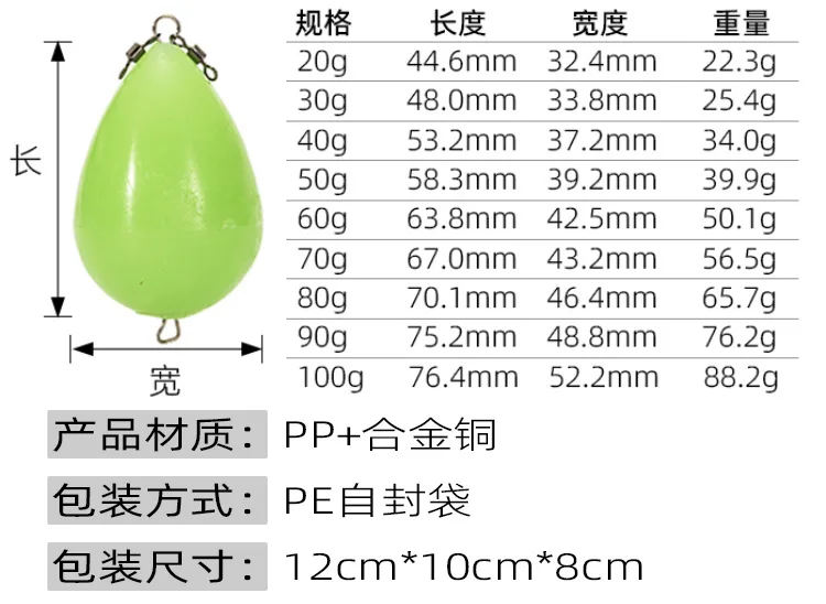 Características del producto: -Con un diseño luminoso en forma de huevo, este flotador de pesca puede lograr un buen efecto luminoso y ser perfecto para la pesca nocturna. -Este flotador de pesca se caracteriza por un diseño sólido, lo que le permite garantizar una alta estabilidad. - Diseño giratorio flexible para evitar que el hilo de pescar se enrede. -Con un peso ligero y un tamaño compacto, este flotador de pesca puede permitirle transportarlo y almacenarlo. convenientemente. -Está hecho de PP de alta calidad y material de aleación de cobre. -Hay 9 tamaños para elegir: 20g, 30g, 40g, 50g, 60g, 70g, 80g, 90g, 100g.Una variedad de especificaciones para satisfacer diversas necesidades de pesca. -Es una herramienta necesaria y práctica para el entusiasta de la pesca.