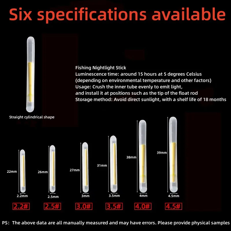 Uso: aplasta el tubo interior uniformemente para emitir luz e instálalo en posiciones como la punta de la varilla flotante.