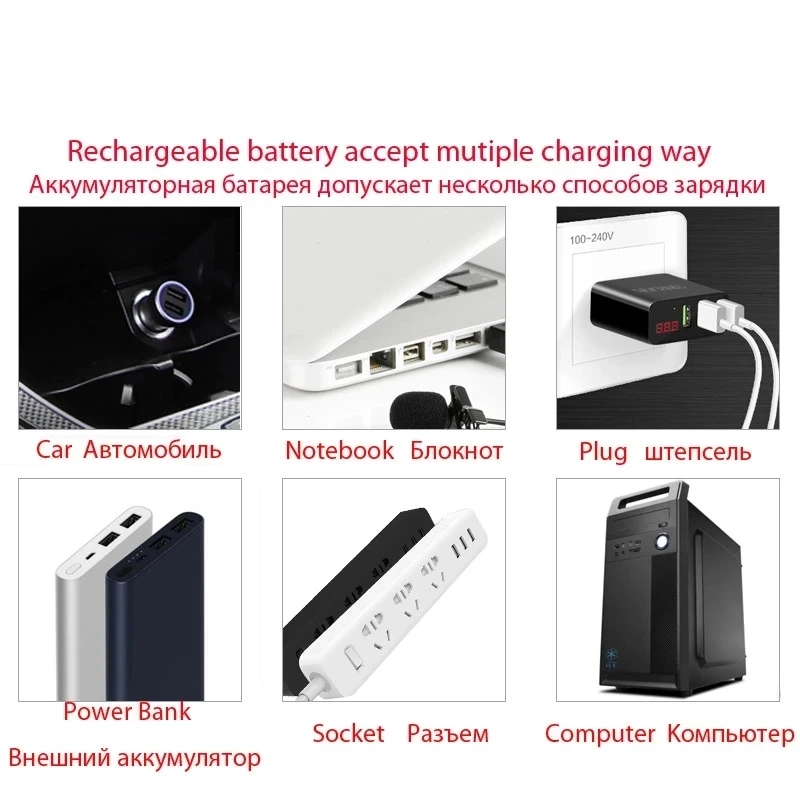 5. Se puede cargar a través de diferentes dispositivos de carga (por ejemplo, coche, teléfono móvil, Banco de energía, PC, etc.)