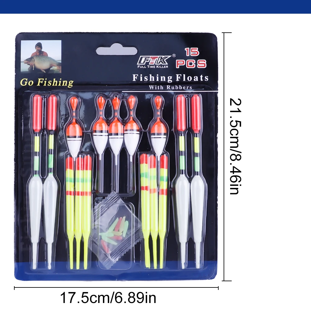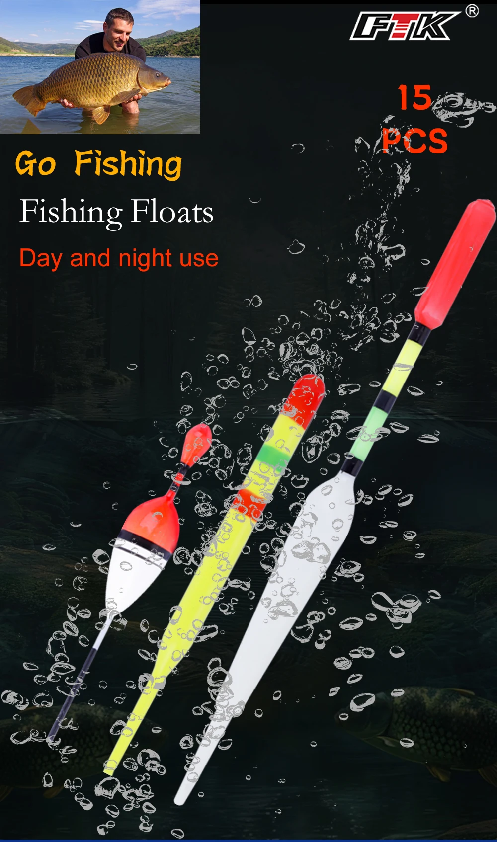 Flotador de pesca FTK, 15 unids/set, boya Vertical profesional con barra luminosa, flotador de señuelo multifunción, aparejos de pesca para pesca de carpa