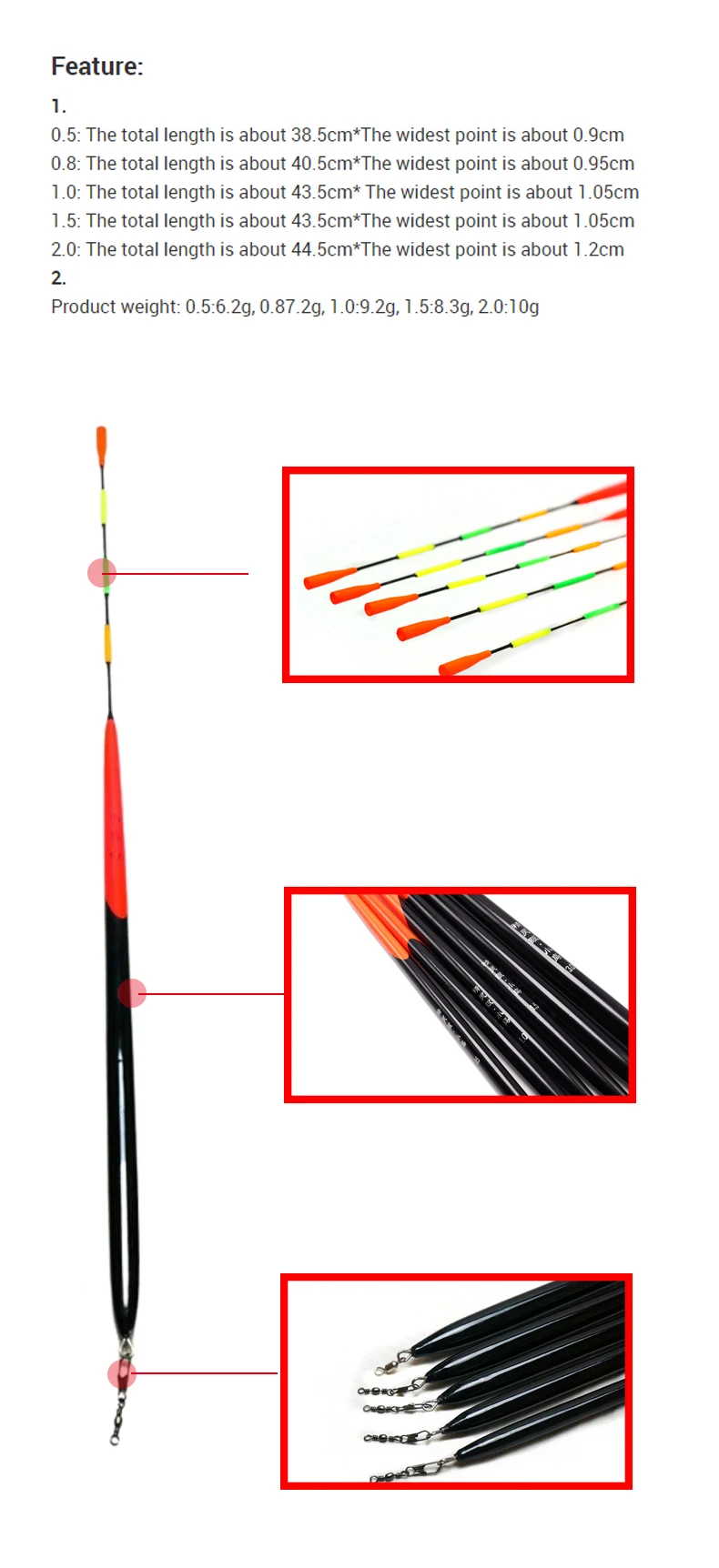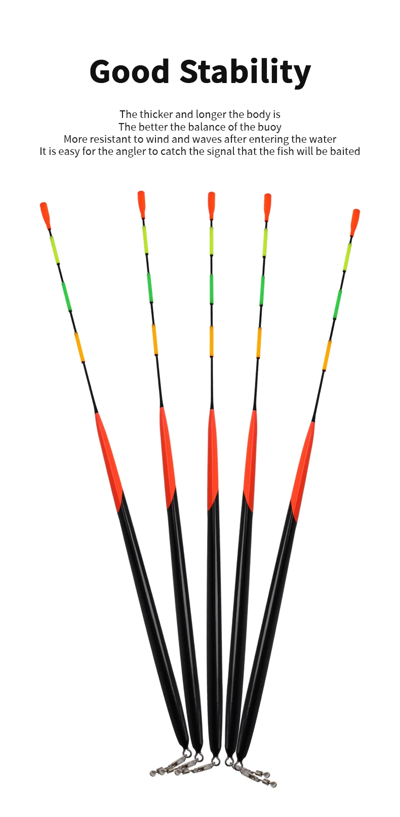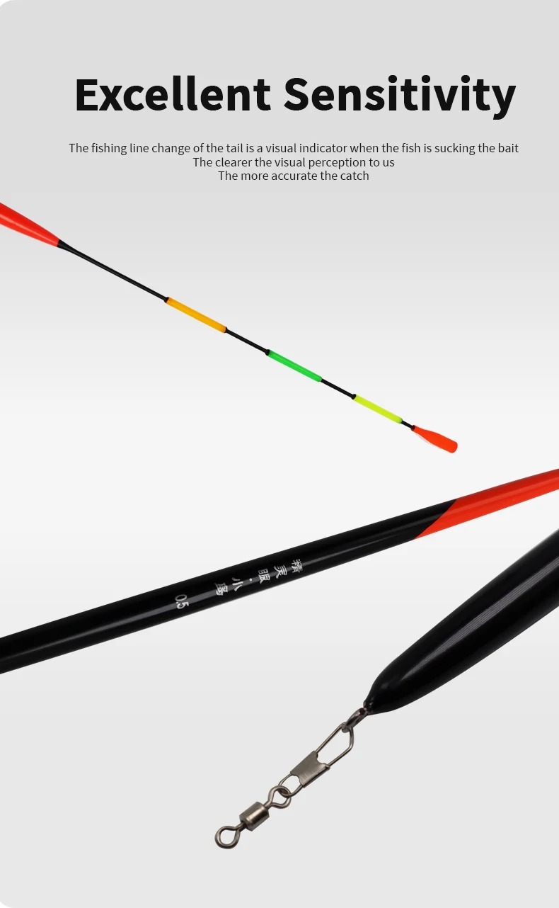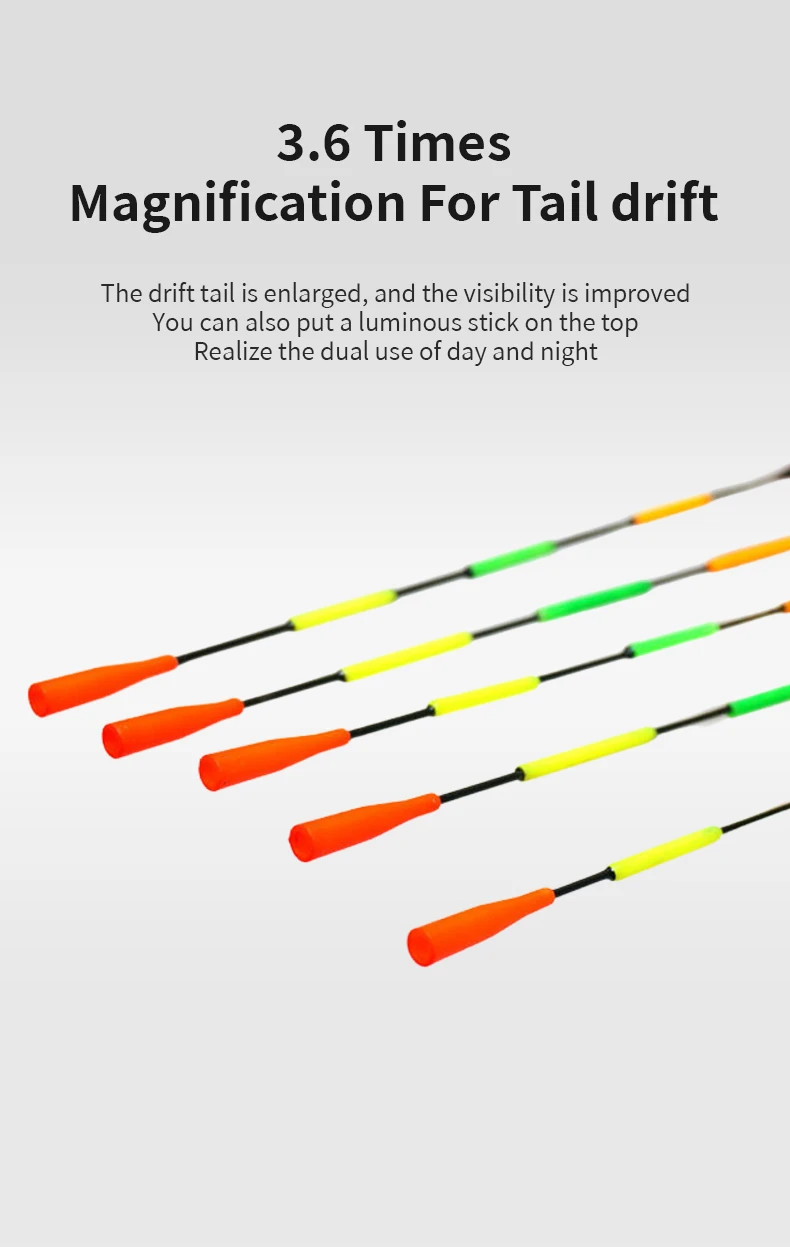3. Buena estabilidad, cuanto más grueso y largo sea el cuerpo estándar, mejor será el equilibrio de la boya, más resistente al viento y a las olas después de entrar en el agua, el pescador es fácil de atrapar el pez en la señal de cebo.