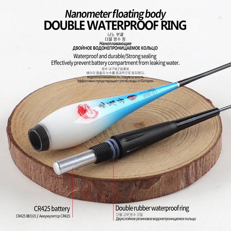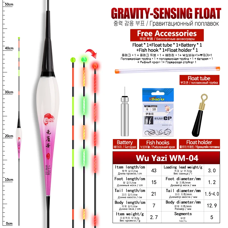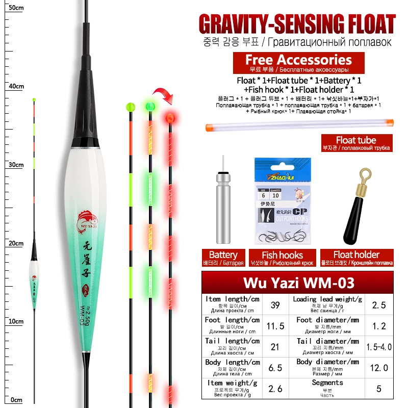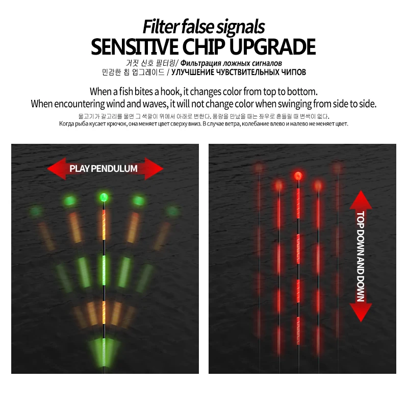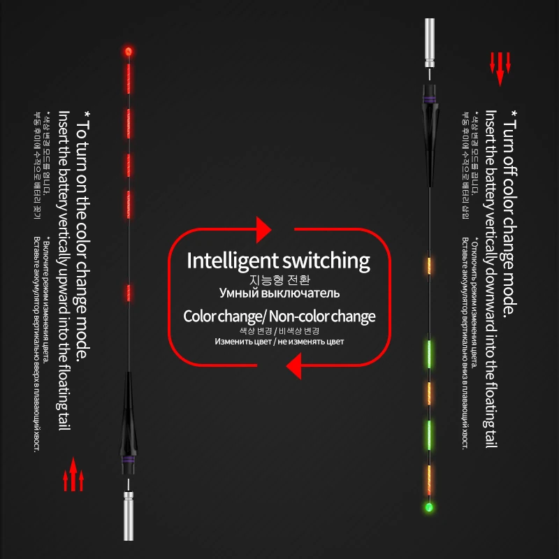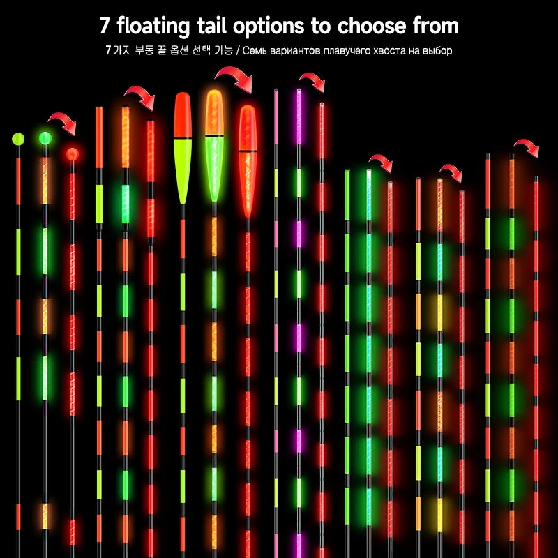 Características:1. La cola del flotador es un sensor de gravedad, que puede cambiar de color cuando el pez muerde los anzuelos de pesca.2. El flotador está hecho de nano material de alta calidad, que hace que los flotadores sean duraderos para su uso.