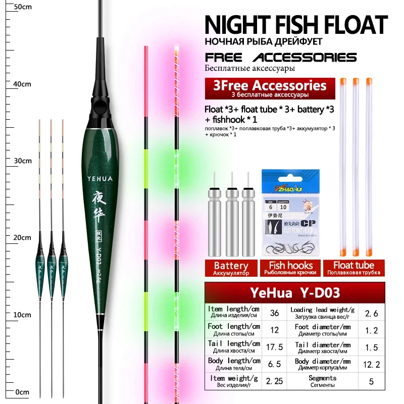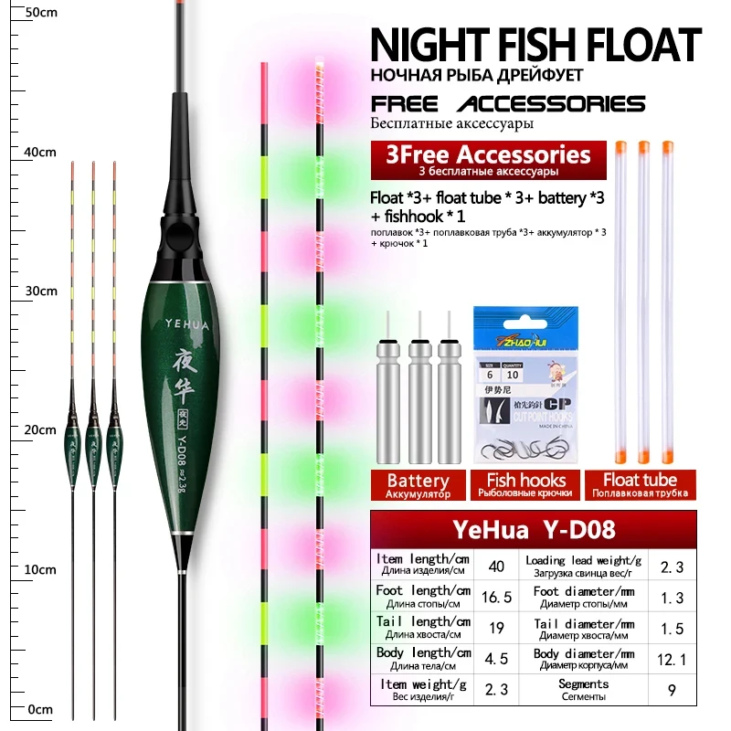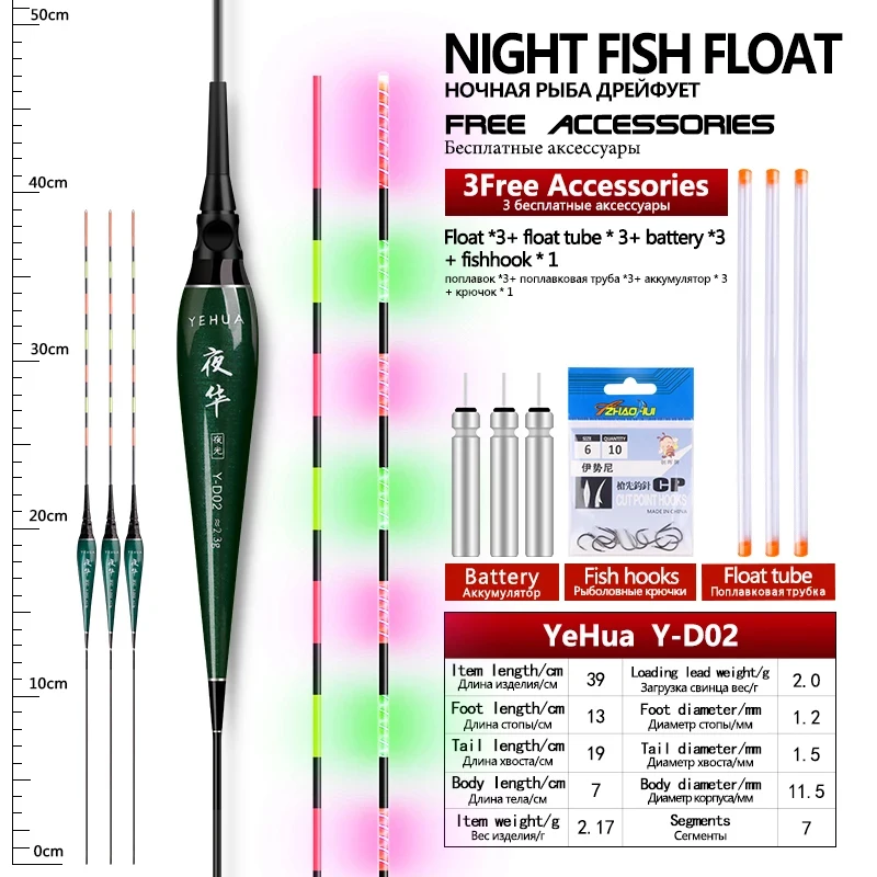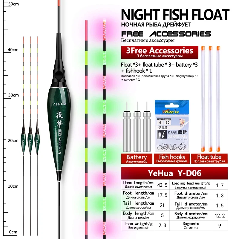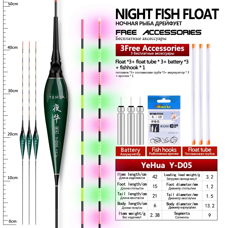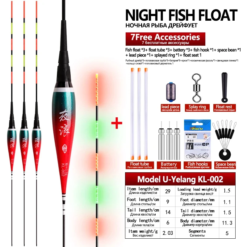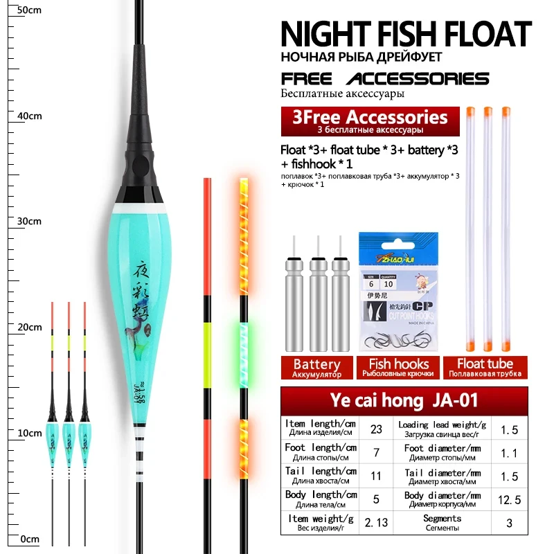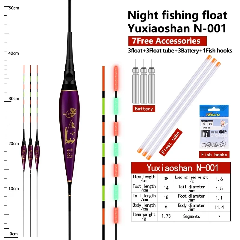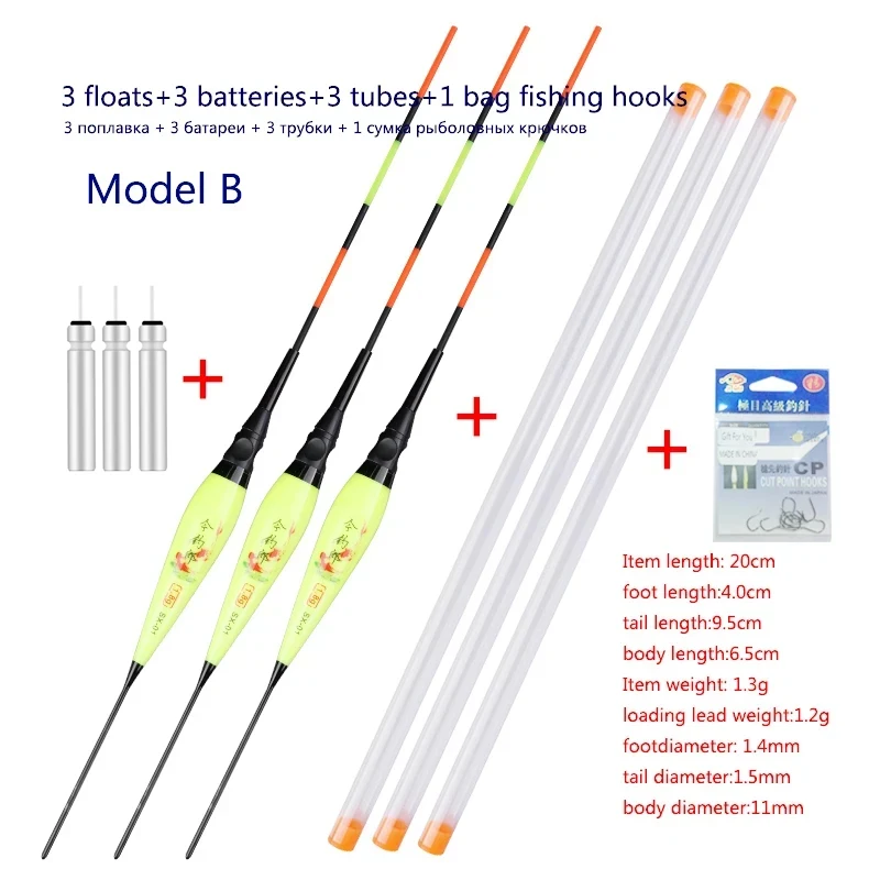 Flotadores luminosos eléctricos de 3 + 3 tubos flotadores + 3 CR425 + 1 frijol espacial + anillo en forma de 1B + 1 soporte flotante + 1 plomo + anzuelos de pesca Nano boya de pescado