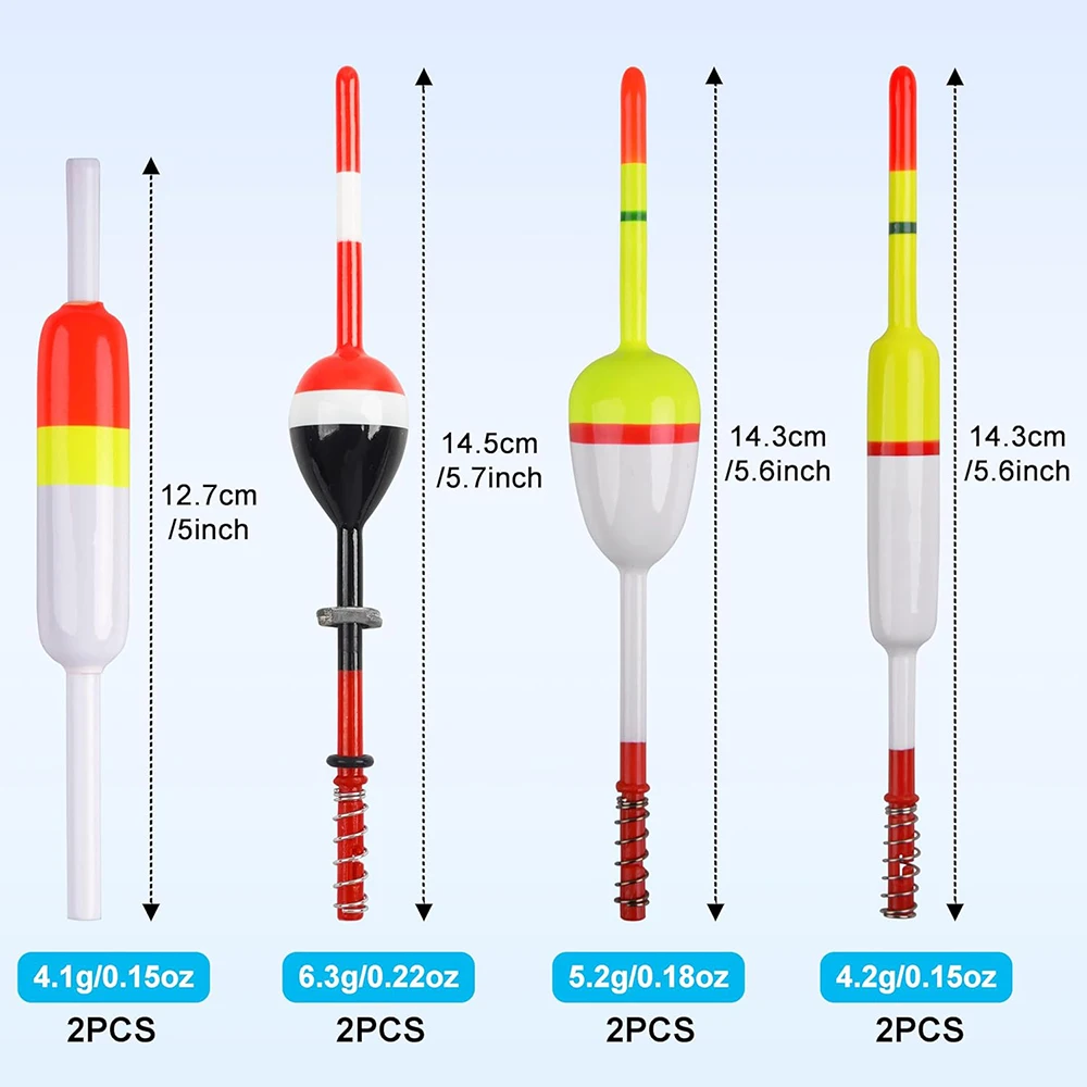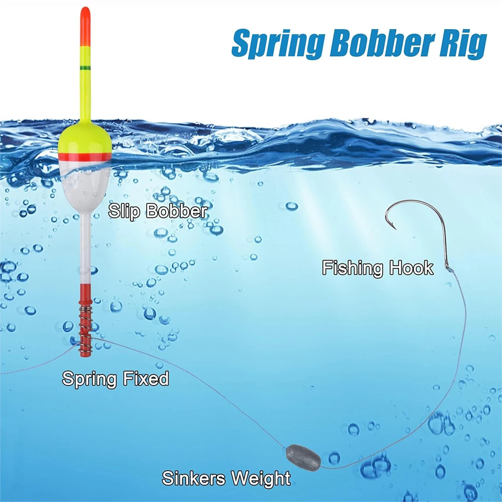 3. Los bobbers Spring Slip son extremadamente sensibles. Muy receptivo cuando el pez muerde el anzuelo. Los bobbers deslizantes se deslizan libremente hacia arriba y hacia abajo de su línea de pesca. Funciona muy bien para la pesca en una variedad de situaciones y profundidades. Perfecto para Crappie Panfish Walleyes Bass Trout en aparejos de pesca de agua salada/fresca.