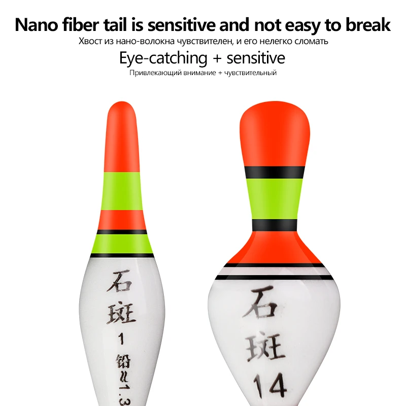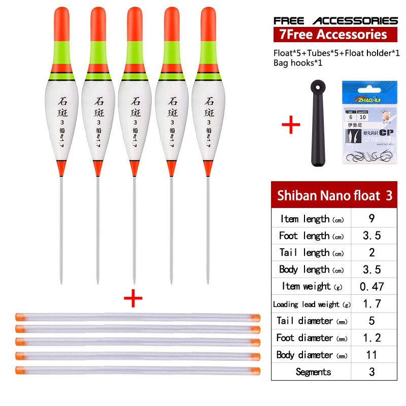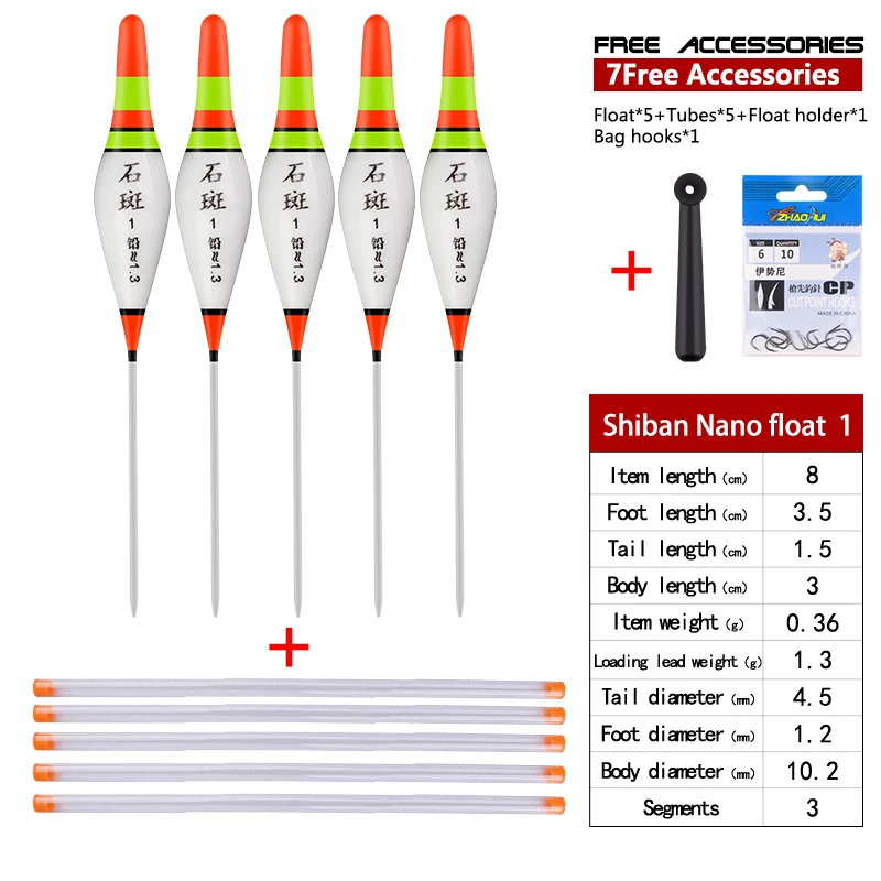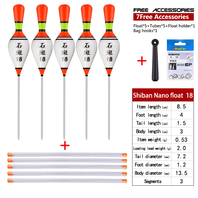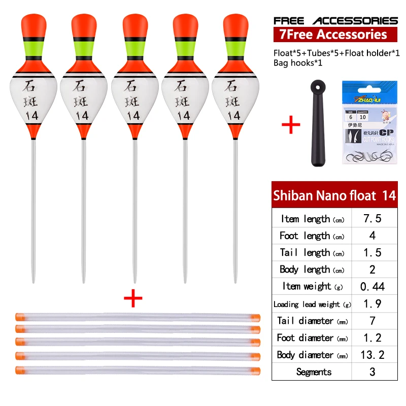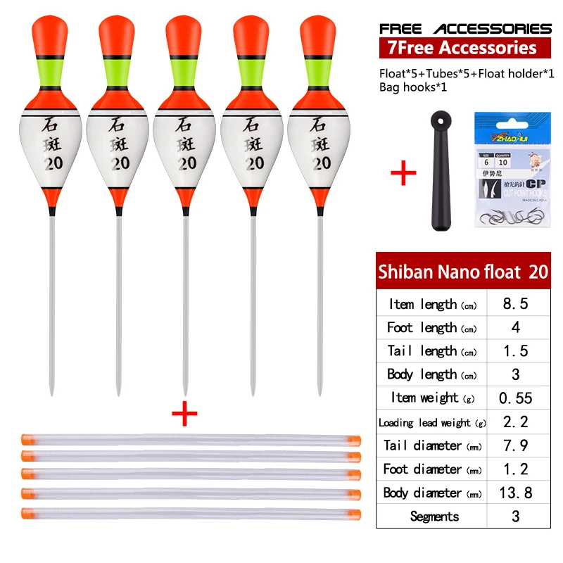 Flotadores DE PESCA DE 5 + 5 tubos de boya + 1 anzuelos de bolsa + 1 soporte de boya, boya de agua poco profunda de Bobber de cola grande, aparejos de herramientas de pesca Nano Vertical