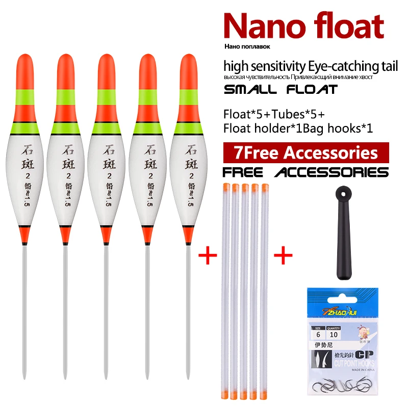 Flotadores DE PESCA DE 5 + 5 tubos de boya + 1 anzuelos de bolsa + 1 soporte de boya, boya de agua poco profunda de Bobber de cola grande, aparejos de herramientas de pesca Nano Vertical