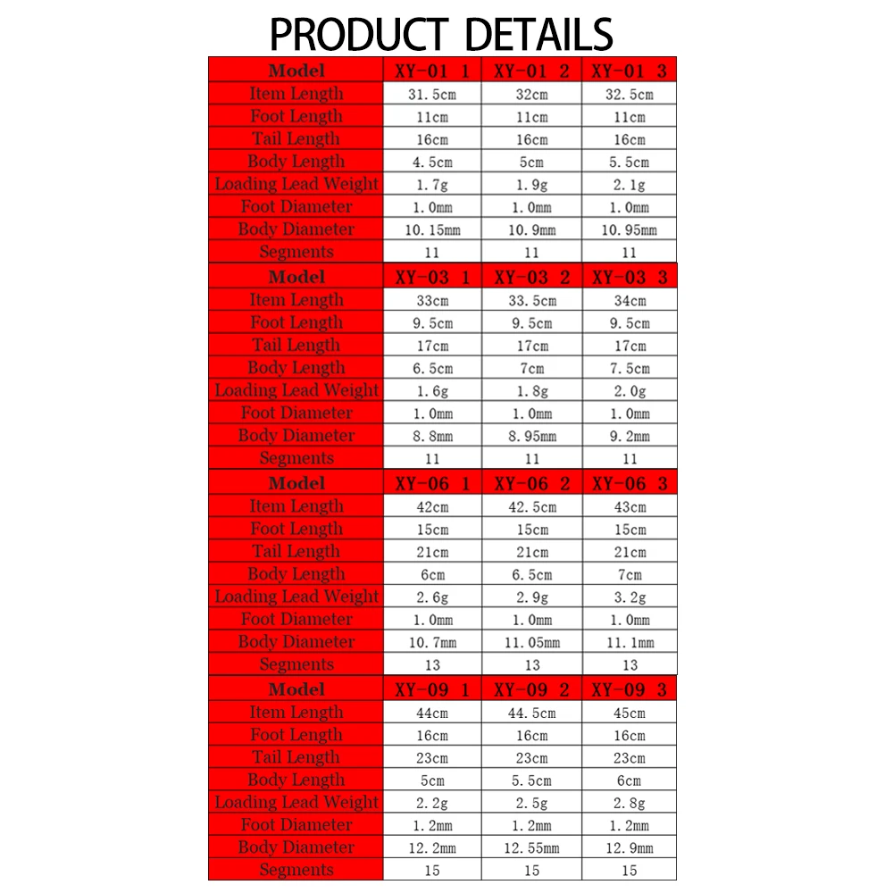 Tamaño: Longitud del artículo: 32,0 cm, longitud del pie: 11,0 cm, longitud de la cola: 16,0 cm, longitud del cuerpo: 5,0 cm, peso del plomo de carga: 1,9g, diámetro del cuerpo: 10,9mm, diámetro del pie: 1,0mm, segmentos: 11