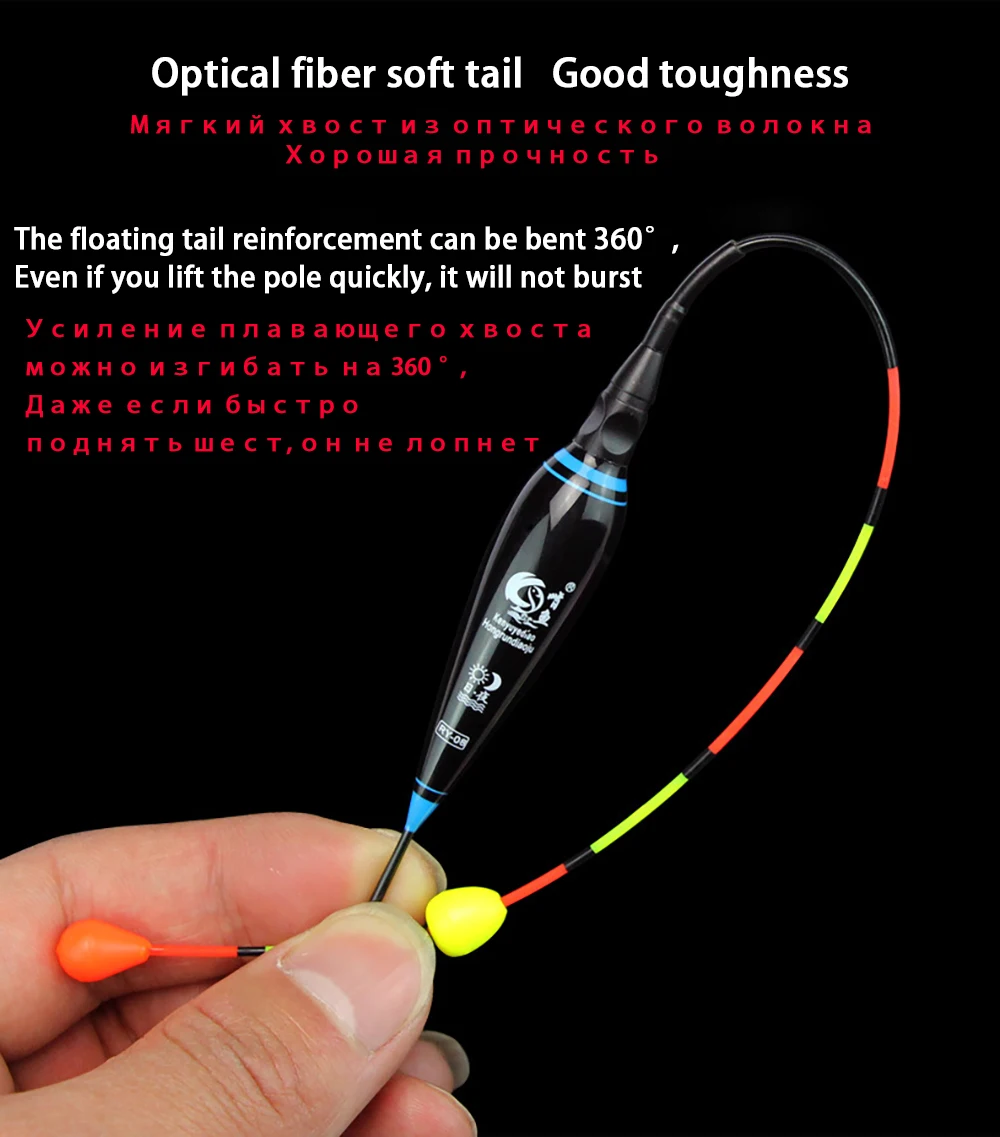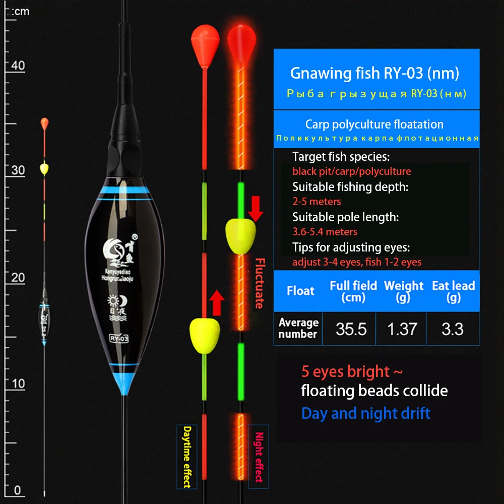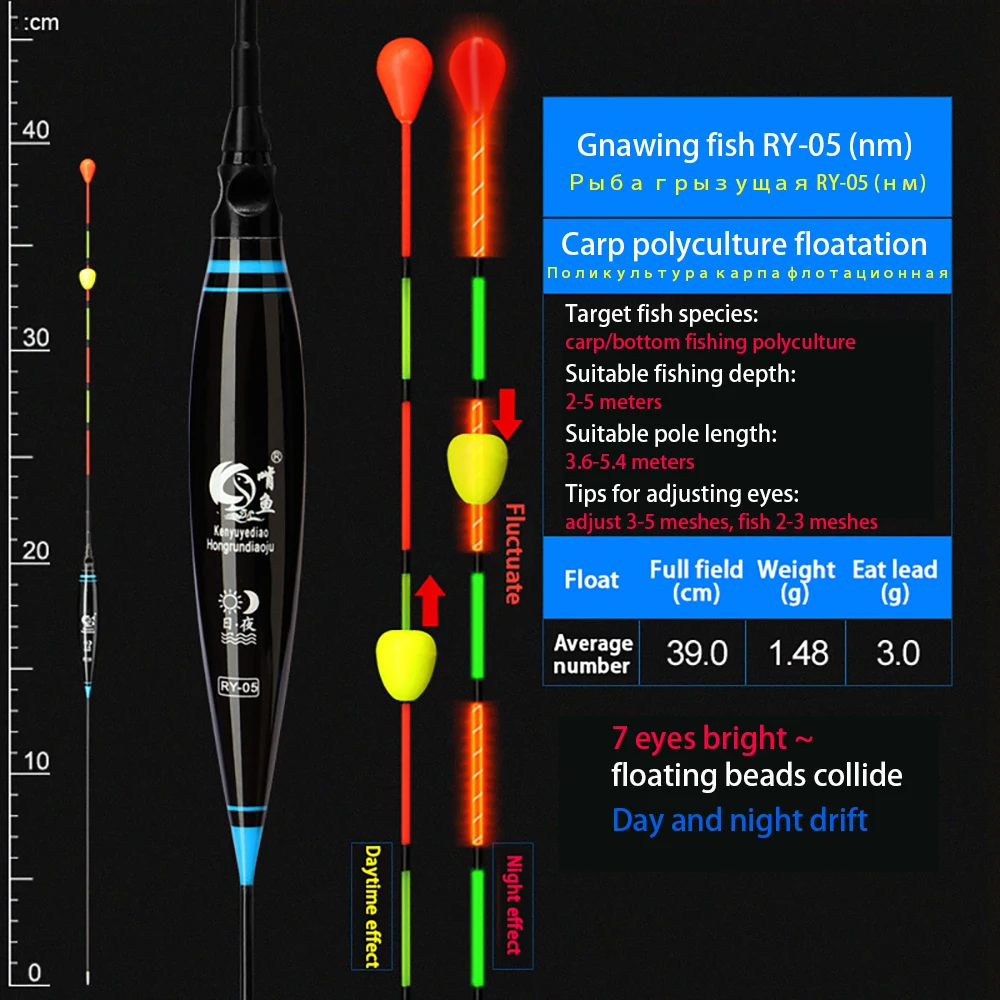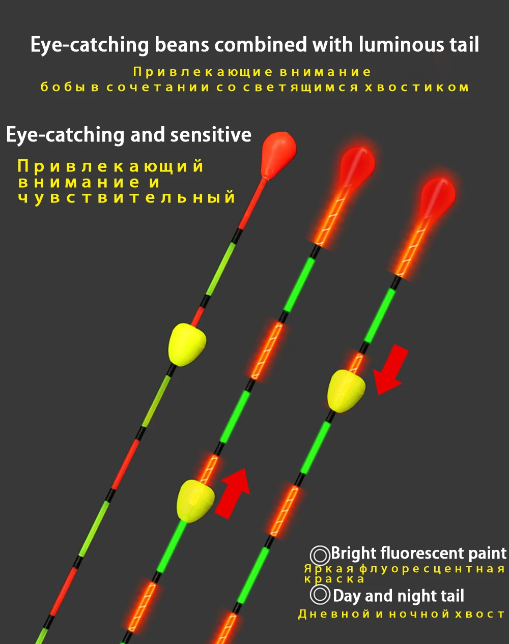 Características: iluminado por la noche, día y noche doble propósito, las cuentas flotantes pueden capturar claramente cada pequeña postura cuando el pez muerde el anzuelo