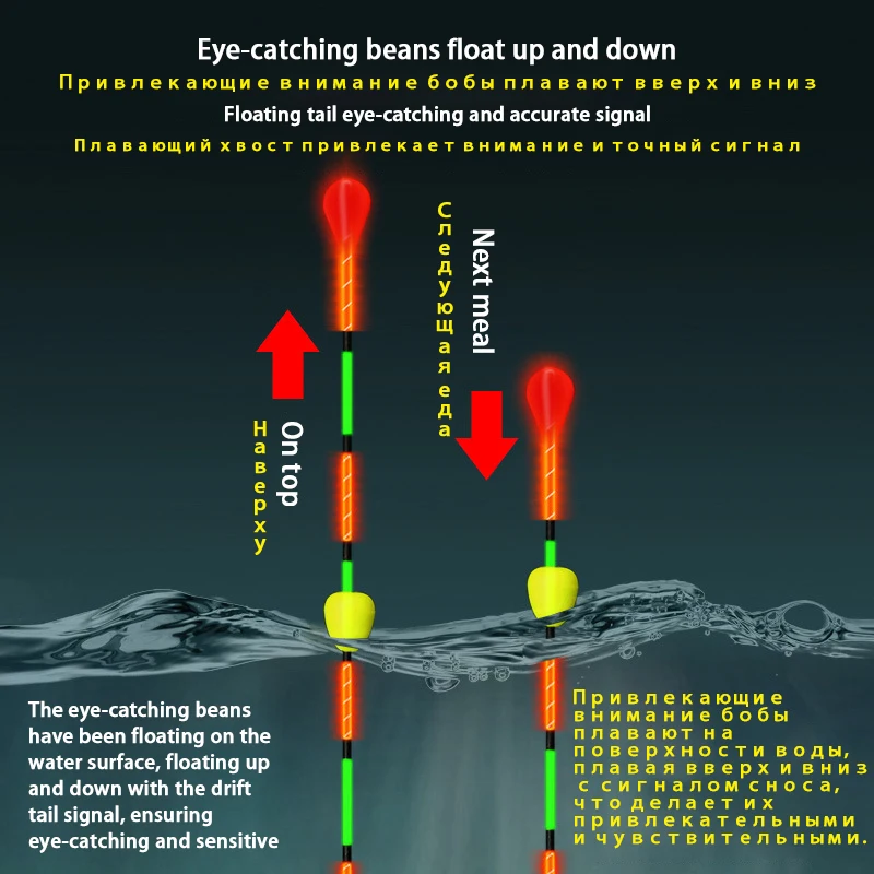 Características: iluminado por la noche, día y noche doble propósito, las cuentas flotantes pueden capturar claramente cada pequeña postura cuando el pez muerde el anzuelo