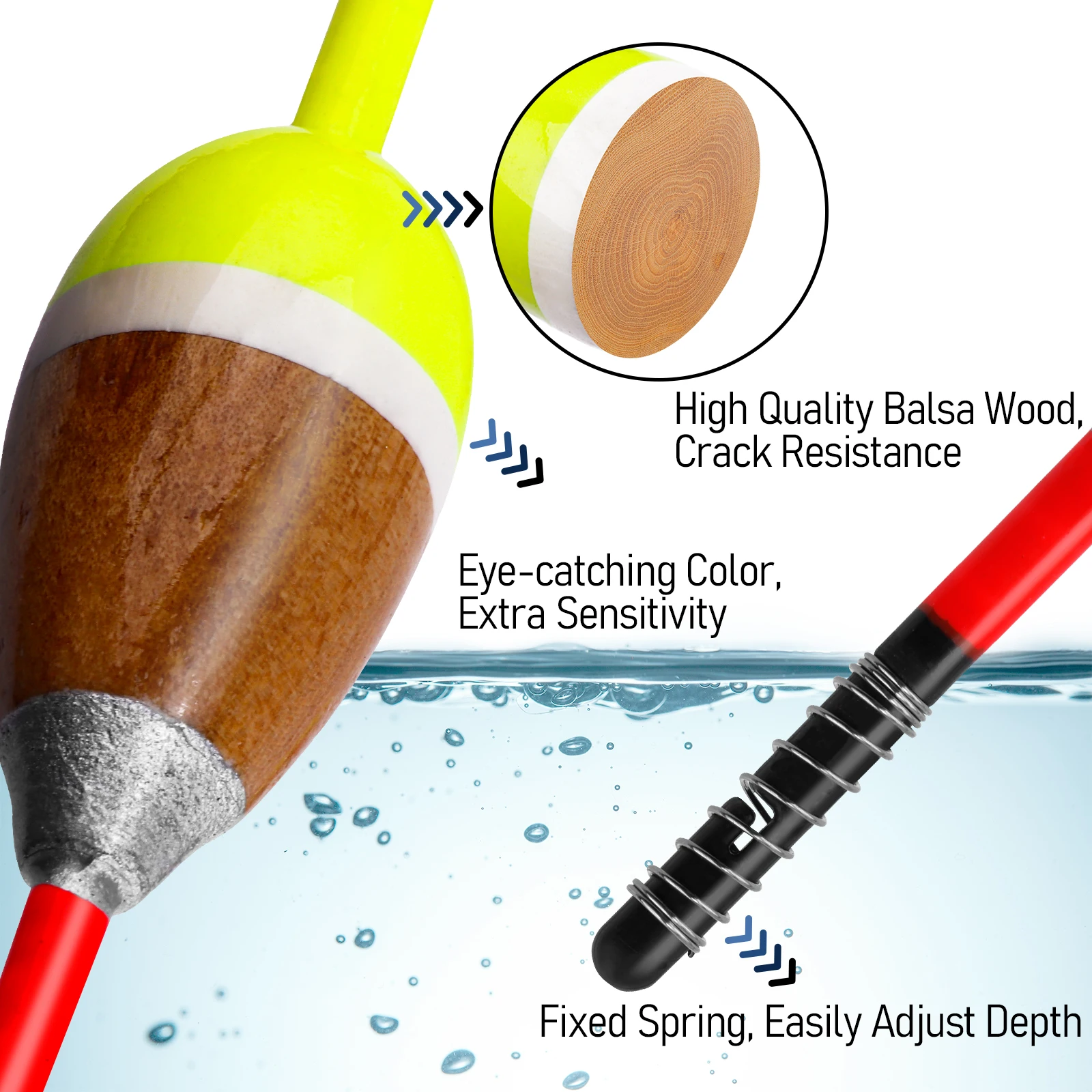 Estos flotadores de pesca están hechos de madera de balsa de alta calidad, que tiene alta flotabilidad, resistencia a las grietas y durabilidad.