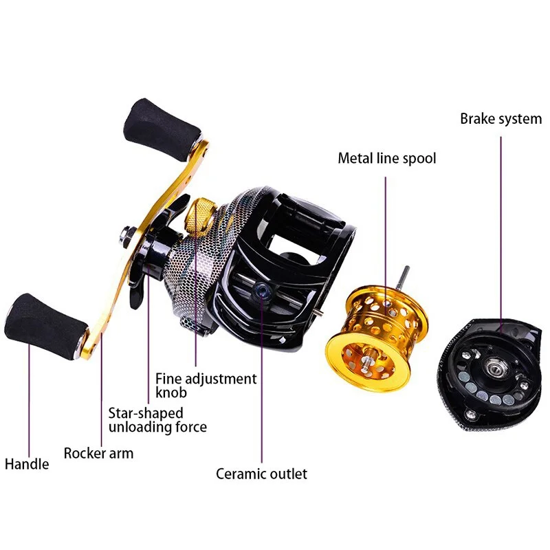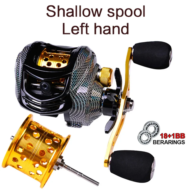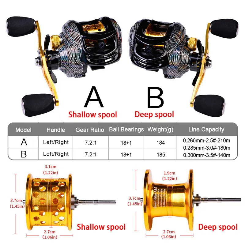 1. El carrete de sedal poco profundo tiene una velocidad de salida de sedal rápida, que es adecuada para cebos ligeros y peces de bajo peso;